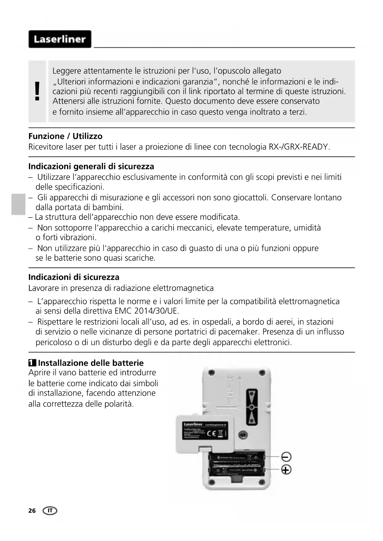Indicazioni generali di sicurezza – Utilizzare l‘apparecchio esclusivamente in conformità con gli scopi previsti e nei limiti delle specicazioni. – Gli apparecchi di misurazione e gli accessori non sono giocattoli. Conservare lontano dalla portata di bambini. – La struttura dell‘apparecchio non deve essere modicata. – Non sottoporre l‘apparecchio a carichi meccanici, elevate temperature, umidità o forti vibrazioni. – Non utilizzare più l‘apparecchio in caso di guasto di una o più funzioni oppure se le batterie sono quasi scariche. Indicazioni di sicurezza Lavorare in presenza di radiazione elettromagnetica – L’apparecchio rispetta le norme e i valori limite per la compatibilità elettromagnetica ai sensi della direttiva EMC 2014/30/UE. – Rispettare le restrizioni locali all’uso, ad es. in ospedali, a bordo di aerei, in stazioni di servizio o nelle vicinanze di persone portatrici di pacemaker. Presenza di un inusso pericoloso o di un disturbo degli e da parte degli apparecchi elettronici. Funzione / Utilizzo Ricevitore laser per tutti i laser a proiezione di linee con tecnologia RX-/GRX-READY. Installazione delle batterie Aprire il vano batterie ed introdurre le batterie come indicato dai simboli di installazione, facendo attenzione alla correttezza delle polarità.