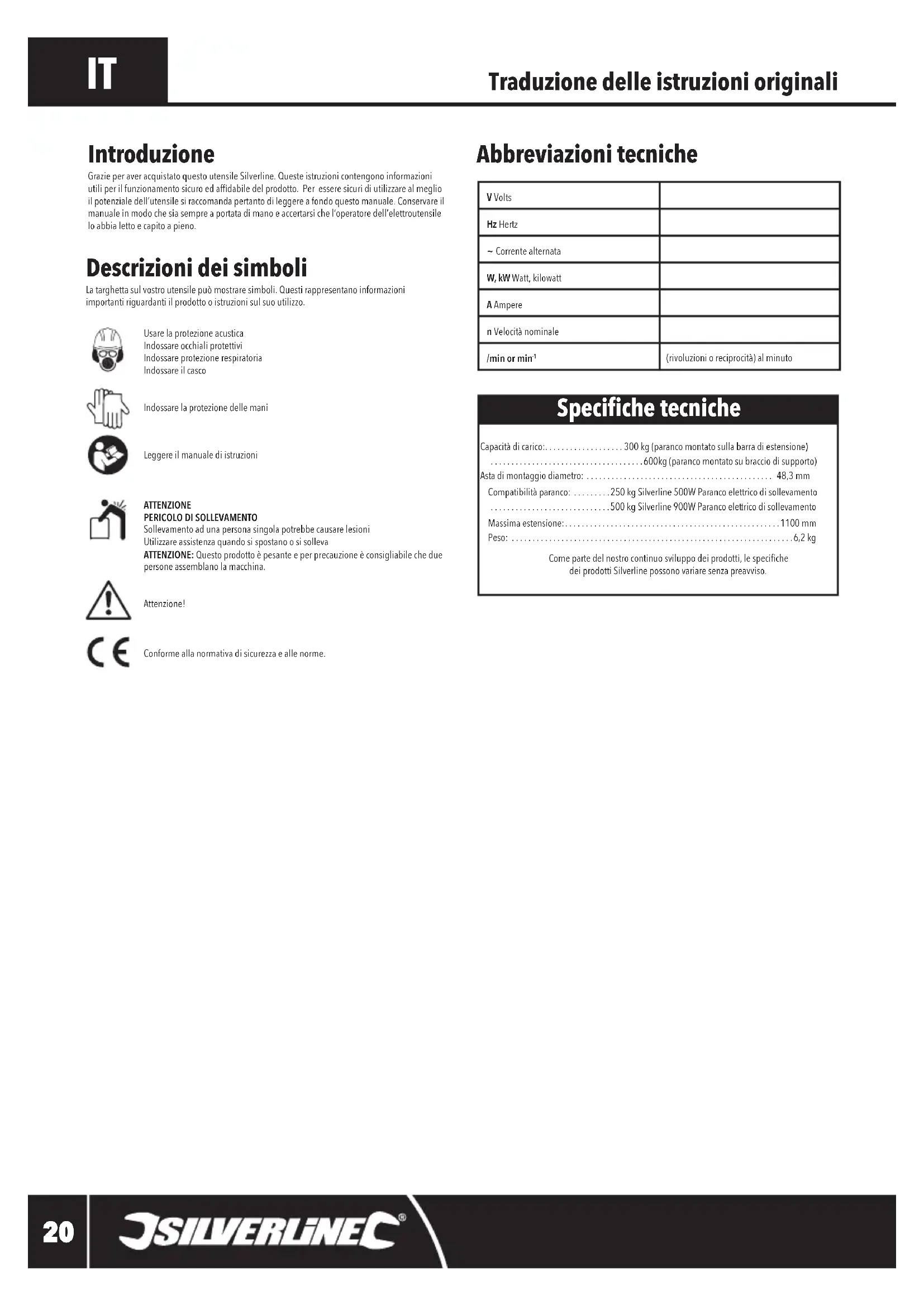 - mm Peso: ,2 kg Comepartedelnostrocontinuosviluppodeiprodotti,lespeciche dei prodotti Silverline possono variare senza preavviso. Introduzione Grazie per aver acquistato questo utensile Silverline. Queste istruzioni contengono informazioni utiliperilfunzionamentosicuroedafdabiledelprodotto.Peresseresicuridiutilizzarealmeglioilpotenzialedell’utensilesiraccomandapertantodileggereafondoquestomanuale.Conservareilmanualeinmodochesiasempreaportatadimanoeaccertarsichel’operatoredell’elettroutensilelo abbia letto e capito a pieno. Speciche tecniche V VoltsHz Hertz~ Corrente alternataW, kW Watt,kilowattA Amperen Velocità nominale/min or min (rivoluzioni o reciprocità) al minuto 407455_Manual.indd 20 20/09/2018 10:40Braccio di supporto sollevamento407455 p. 6