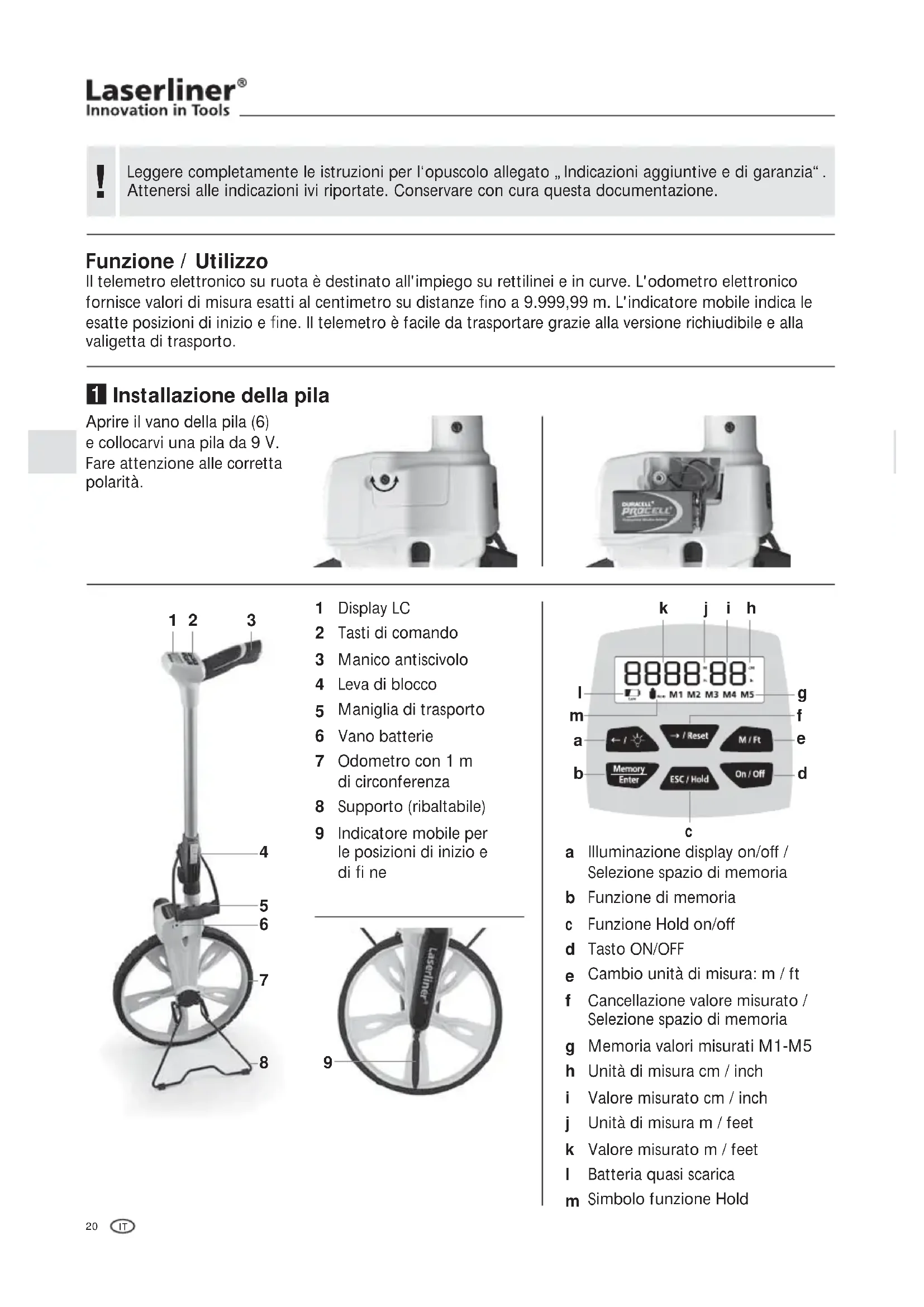 Funzione / Utilizzo Il telemetro elettronico su ruota è destinato all'impiego su rettilinei e in curve. L'odometro elettronico fornisce valori di misura esatti al centimetro su distanze Ö no a 9.999,99 m. L'indicatore mobile indica le esatte posizioni di inizio e Ö ne. Il telemetro è facile da trasportare grazie alla versione richiudibile e alla valigetta di trasporto. Aprire il vano della pila (6) e collocarvi una pila da 9 V. Fare attenzione alle corretta polarità. Installazione della pila Display LC Tasti di comando Manico antiscivolo Leva di blocco Maniglia di trasporto Vano batterie Odometro con 1 m di circonferenza Supporto (ribaltabile) Indicatore mobile per le posizioni di inizio e di Ö ne