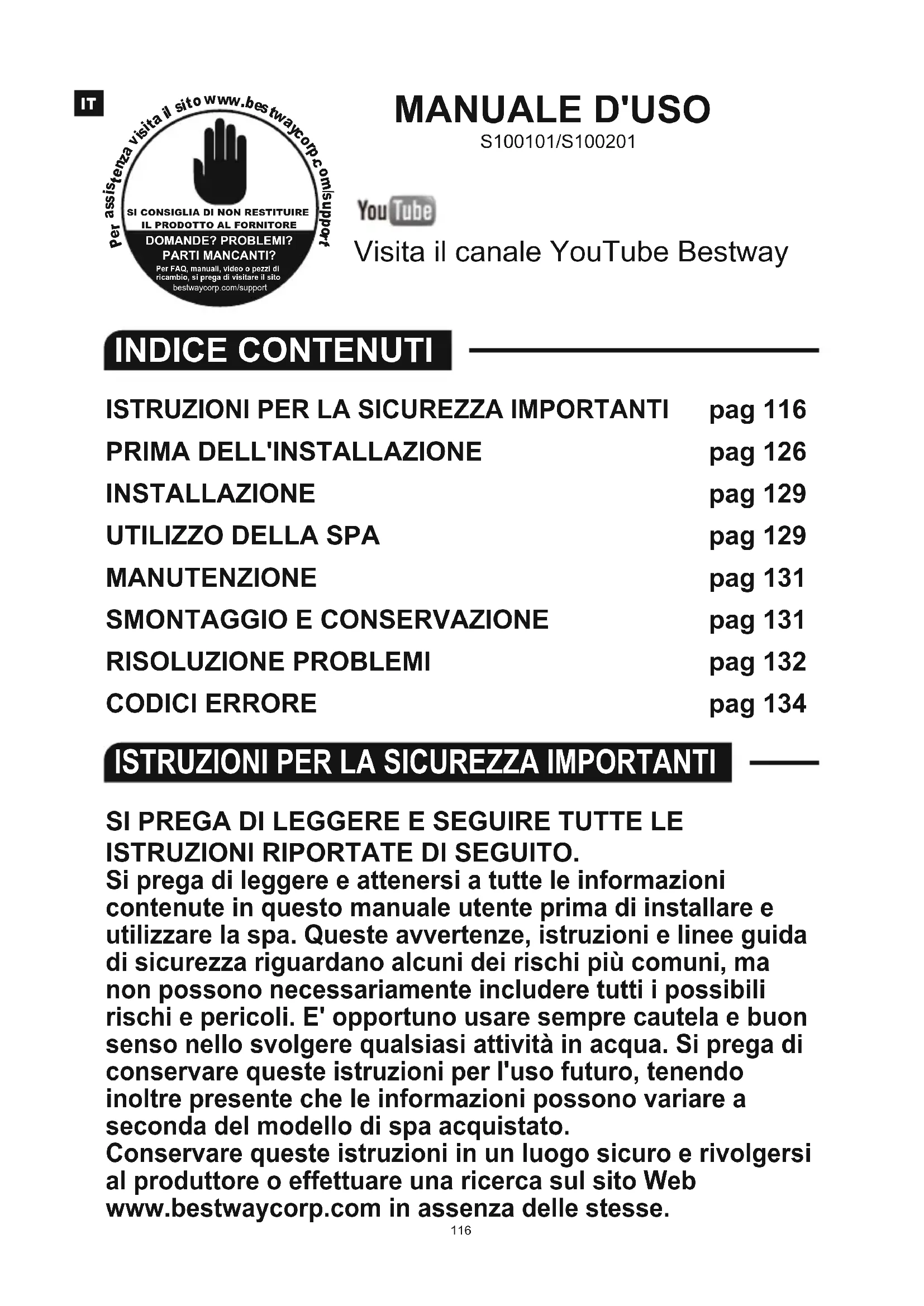 DOMANDE? PROBLEMI? PARTI MANCANTI? Per FAQ, manuali, video o pezzi di ricambio, si prega di visitare il sito bestwaycorp.com/support 116SI PREGA DI LEGGERE E SEGUIRE TUTTE LE ISTRUZIONI RIPORTATE DI SEGUITO. Si prega di leggere e attenersi a tutte le informazioni contenute in questo manuale utente prima di installare e utilizzare la spa. Queste avvertenze, istruzioni e linee guida di sicurezza riguardano alcuni dei rischi più comuni, ma non possono necessariamente includere tutti i possibili rischi e pericoli. E' opportuno usare sempre cautela e buon senso nello svolgere qualsiasi attività in acqua. Si prega di conservare queste istruzioni per l'uso futuro, tenendo inoltre presente che le informazioni possono variare a seconda del modello di spa acquistato. Conservare queste istruzioni in un luogo sicuro e rivolgersi al produttore o effettuare una ricerca sul sito Web www.bestwaycorp.com in assenza delle stesse.