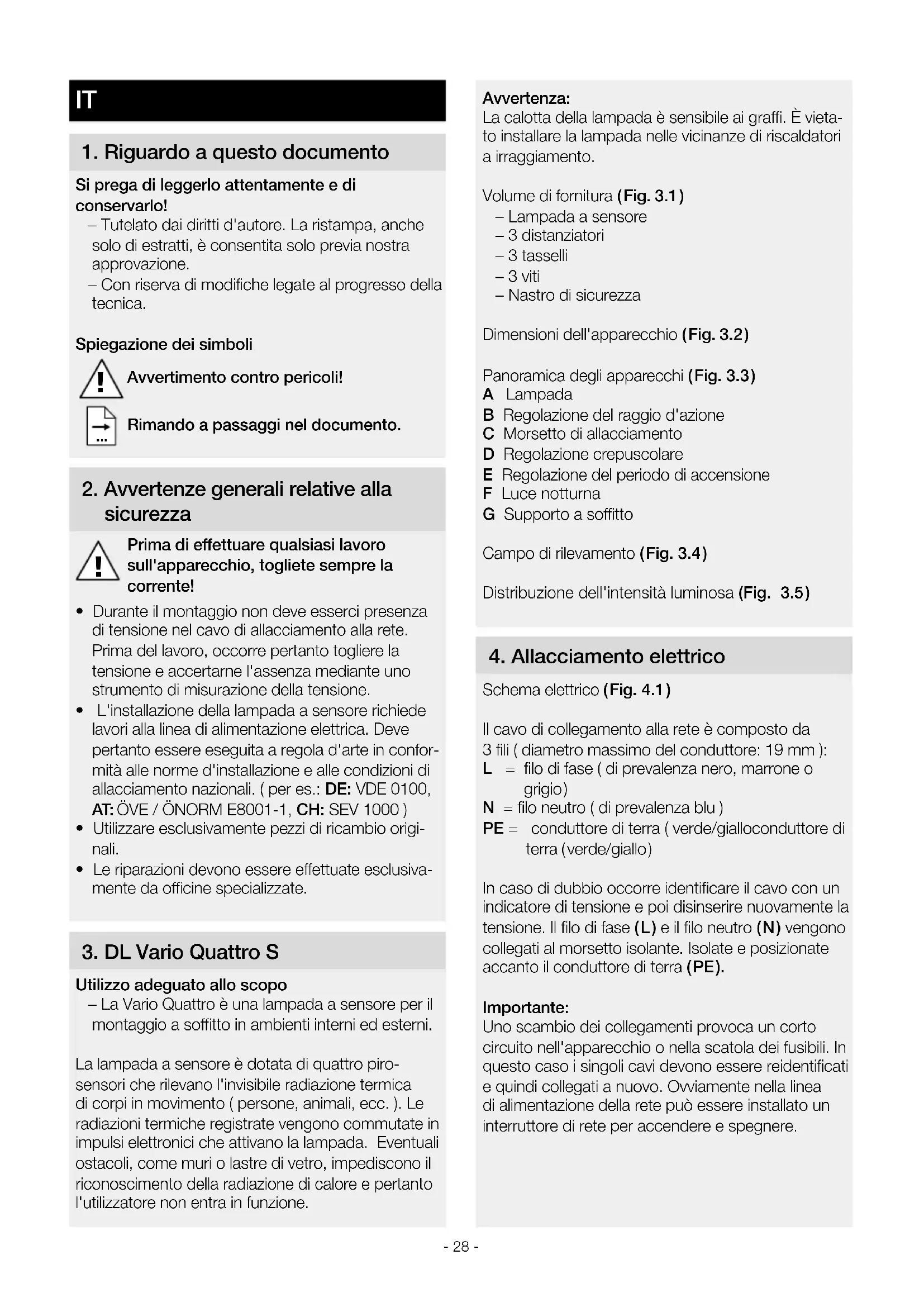 Utilizzo adeguato allo scopo – La Vario Quattro è una lampada a sensore per il montaggio a sotto in ambienti interni ed esterni. La lampada a sensore è dotata di quattro piro- sensori che rilevano l'invisibile radiazione termica di corpi in movimento ( persone, animali, ecc. ). Le radiazioni termiche registrate vengono commutate in impulsi elettronici che attivano la lampada. Eventuali ostacoli, come muri o lastre di vetro, impediscono il riconoscimento della radiazione di calore e pertanto l'utilizzatore non entra in funzione.