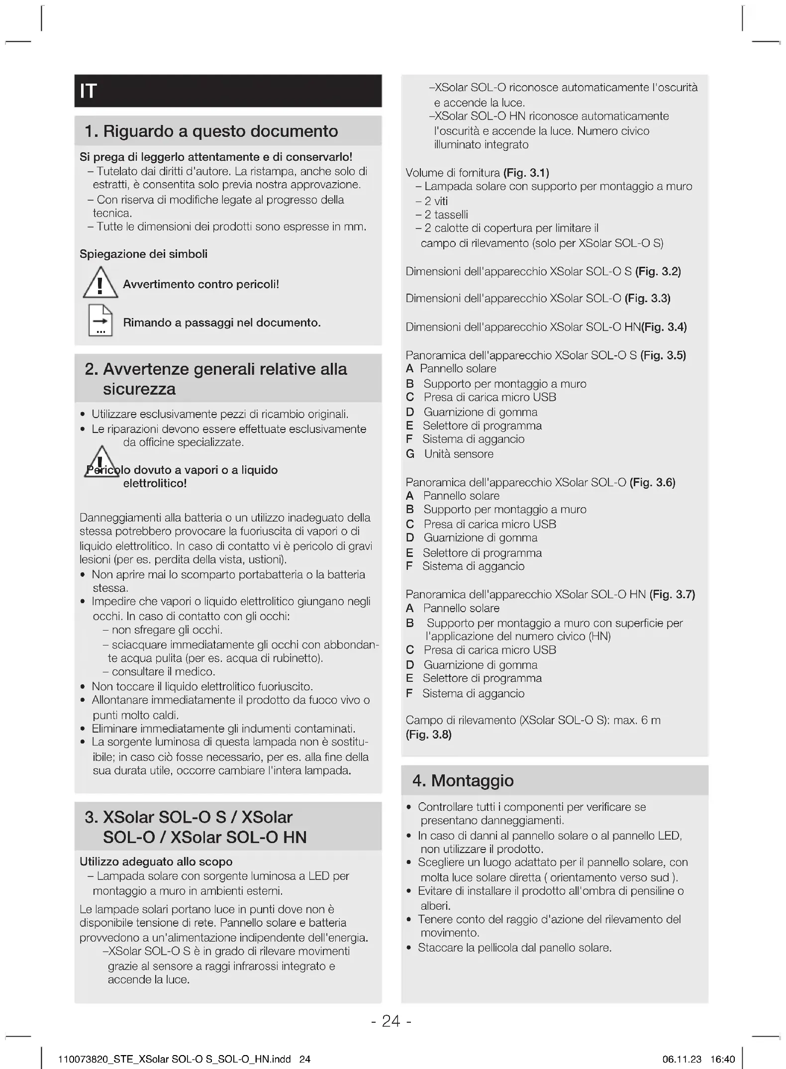 110073820_STE_XSolar SOL-O S_SOL-O_HN.indd 27110073820_STE_XSolar SOL-O S_SOL-O_HN.indd 27 06.11.23 16:4006.11.23 16:40- 28 - Guasto Causa Rimedio Il LED rosso lampeggia nel sensore di movimento/nella lampada ■ La capacità della batteria è troppo ridotta ■ Caricare la batteria con un adattatore di carica micro USB La lampada non si accende ■ La capacità della batteria è troppo ridotta ■ Campo di rilevamento non impostato con direzione giusta ■ Caricare la batteria con un adattatore di carica micro USB ■ Controllare il campo di rilevamento La lampada non si spegne ■ Movimento continuo nel campo di rilevamento ■ Controllare il campo di rilevamento La lampada si accende a sproposito ■ Movimento incontrollato all'interno del campo di rilevamento: il vento muove alberi e cespugli nel campo di rilevamento. Vengono rilevati veicoli sulla strada. Improvvisi sbalzi di temperatura dovuti a condizioni atmosferiche (vento pioggia, neve) o causati da aria di scarico di ventilatori o da aria proveniente da finestre aperte. ■ La lampada vacilla (si muove) per es. in seguito a boe di vento o a forte precipitazione ■ Controllare il campo di rilevamento ■ Montare la lampada su una base stabile La batteria non si carica ■ Il pannello solare è sporco ■ Il luogo d'installazione del pannello solare non è adeguato. ■ Pulire il pannello solare con un panno morbido e un detergente delicato ■ Controllare il luogo d'installazione (deve essere per quanto possibile esposto alla luce solare diretta) Pericolo di danni a cose in caso di non utilizzo prolungato ■ Se la lampada non viene utilizzata per un periodo prolungato (per es. se viene messa a magazzino) la batteria si potrebbe distruggere in seguito a scarica profonda ■ Impostare il selettore di programma su P0 risp. OFF ■ Prima di una sospensione prolungata dell'utilizzo, caricare completamente l'accumulatore ■ Durante il periodo di non utilizzo, caricare periodicamente l'accumulatore 11 Disturbi di funzionamento 110073820_STE_XSolar SOL-O S_SOL-O_HN.indd 28110073820_STE_XSolar SOL-O S_SOL-O_HN.indd 28 06.11.23 16:4006.11.23 16:40- 29 - – XSolar SOL-O HN detecta automáticamente la oscuridad y enciende la luz. Número de casa iluminado integrado.Volumen de suministro (Fig 31) – Lámpara solar con soporte de pared – 2 tornillos – 2 espigas – 2 cubiertas para limitar el campo de detección (Solo XSolarSOL-OS)Dimensiones del producto XSolarSOL-OS (Fig 32)Dimensiones del producto XSolarSOL-O (Fig 33)Dimensiones del producto XSolar SOL-OHN (Fig 34)Visión general del equipo XSolar SOL-OS (Fig 35)A Panel solarB Soporte de paredC Conector de carga micro-USBD Junta de gomaE Selector de programaF CierreG Unidad del sensorVisión general del equipo XSolarSOL-O (Fig 36)A Panel solarB Soporte de paredC Conector de carga micro-USBD Junta de gomaE Selector de programaF CierreVisión general del equipo XSolarSOL-OHN (Fig 37)A Panel solarB Soporte de pared con área luminosa para número de casa (HN)C Conector de carga micro-USBD Junta de gomaE Selector de programaF CierreCampo de detección (XSolarSOL-OS): máx. 6m (Fig 38) 4 Montaje