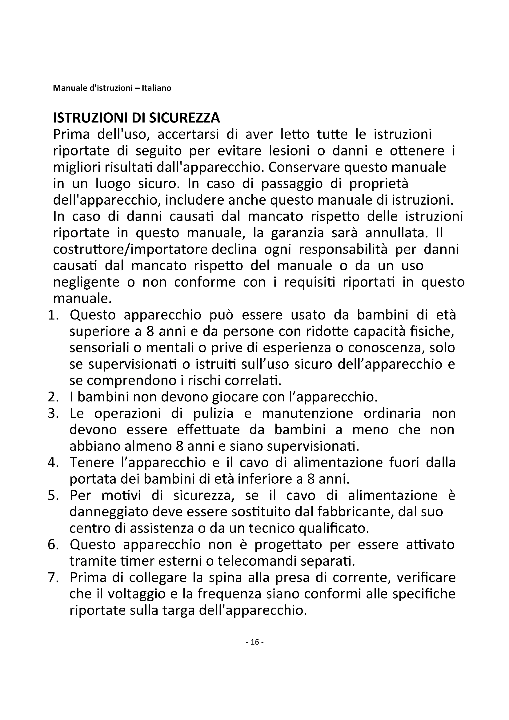 Prima dell'uso, accertarsi di aver letto tutte le istruzioni riportate di seguito per evitare lesioni o danni e ottenere i migliori risultati dall'apparecchio. Conservare questo manuale in un luogo sicuro. In caso di passaggio di proprietà dell'apparecchio, includere anche questo manuale di istruzioni. In caso di danni causati dal mancato rispetto delle istruzioni riportate in questo manuale, la garanzia sarà annullata. Il costruttore/importatore declina ogni responsabilità per danni causati dal mancato rispetto del manuale o da un uso negligente o non conforme con i requisiti riportati in questo manuale.