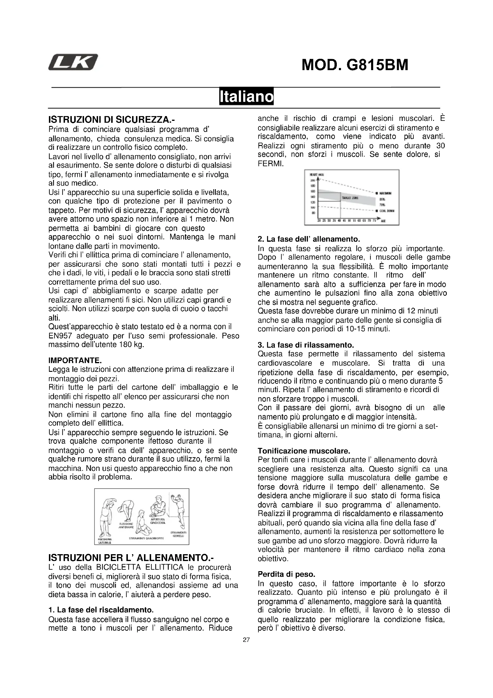 Prima di cominciare qualsiasi programma d’ allenamento, chieda consulenza medica. Si consiglia di realizzare un controllo fisico completo. Lavori nel livello d’ allenamento consigliato, non arrivi al esaurimento. Se sente dolore o disturbi di qualsiasi tipo, fermi l’ allenamento inmediatamente e si rivolga al suo medico. Usi l’ apparecchio su una superficie solida e livellata, con qualche tipo di protezione per il pavimento o tappeto. Per motivi di sicurezza, l’ apparecchio dovrà avere attorno uno spazio non inferiore ai 1 metro. Non permetta ai bambini di giocare con questo apparecchio o nei suoi dintorni. Mantenga le mani lontane dalle parti in movimento. Verifi chi l’ ellittica prima di cominciare l’ allenamento, per assicurarsi che sono stati montati tutti i pezzi e che i dadi, le viti, i pedali e le braccia sono stati stretti correttamente prima del suo uso. Usi capi d’ abbigliamento e scarpe adatte per realizzare allenamenti fi sici. Non utilizzi capi grandi e sciolti. Non utilizzi scarpe con suola di cuoio o tacchi alti. Quest’apparecchio è stato testato ed è a norma con il EN957 adeguato per l’uso semi professionale. Peso massimo dell’utente 180 kg. IMPORTANTE.