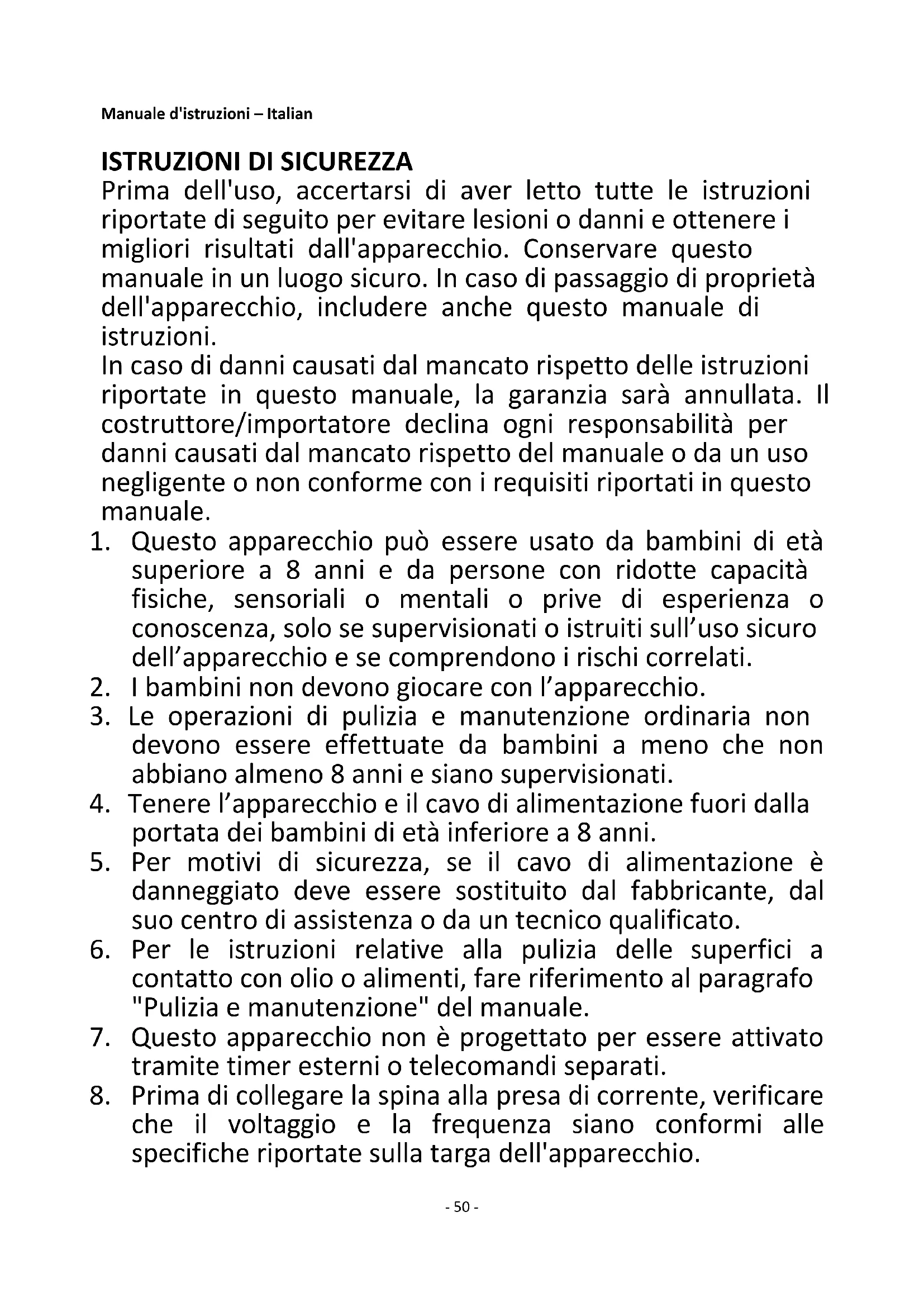 Prima dell'uso, accertarsi di aver letto tutte le istruzioni riportate di seguito per evitare lesioni o danni e ottenere i migliori risultati dall'apparecchio. Conservare questo manuale in un luogo sicuro. In caso di passaggio di proprietà dell'apparecchio, includere anche questo manuale di istruzioni. In caso di danni causati dal mancato rispetto delle istruzioni riportate in questo manuale, la garanzia sarà annullata. Il costruttore/importatore declina ogni responsabilità per danni causati dal mancato rispetto del manuale o da un uso negligente o non conforme con i requisiti riportati in questo manuale.