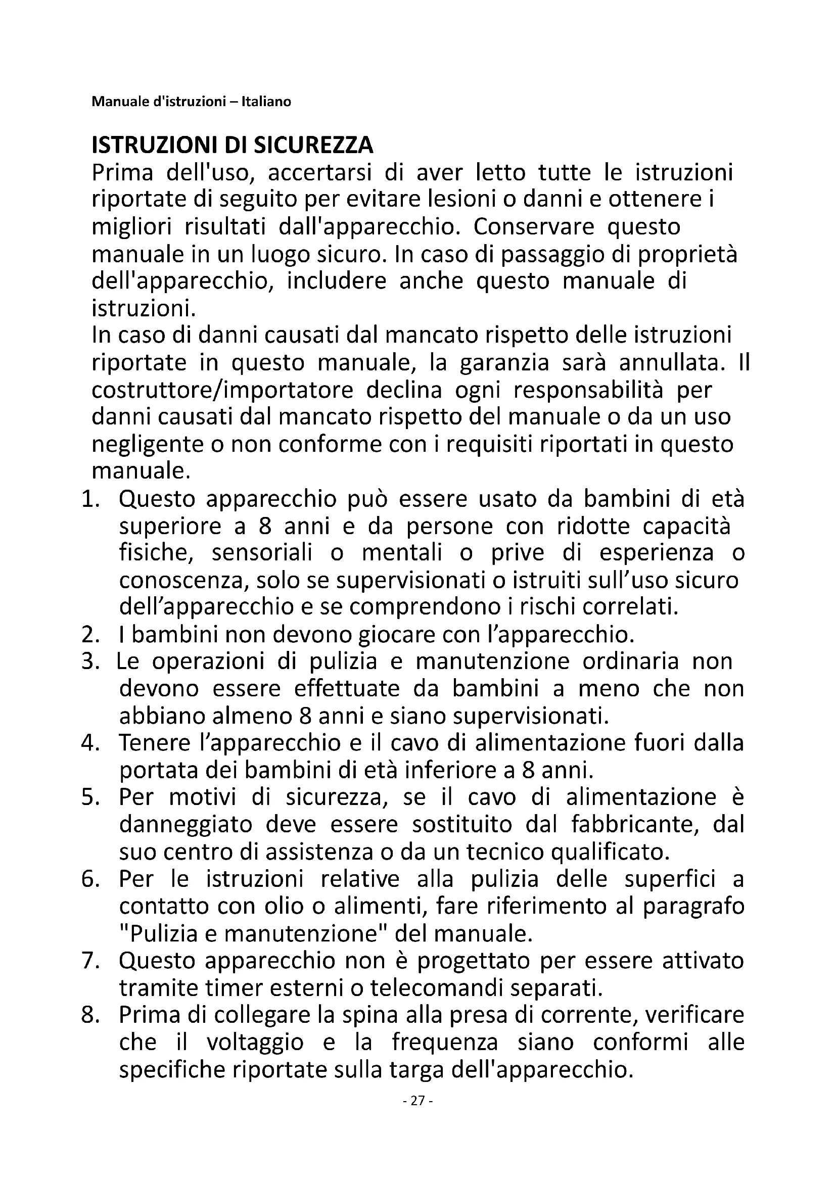 Prima dell'uso, accertarsi di aver letto tutte le istruzioni riportate di seguito per evitare lesioni o danni e ottenere i migliori risultati dall'apparecchio. Conservare questo manuale in un luogo sicuro. In caso di passaggio di proprietà dell'apparecchio, includere anche questo manuale di istruzioni. In caso di danni causati dal mancato rispetto delle istruzioni riportate in questo manuale, la garanzia sarà annullata. Il costruttore/importatore declina ogni responsabilità per danni causati dal mancato rispetto del manuale o da un uso negligente o non conforme con i requisiti riportati in questo manuale.
