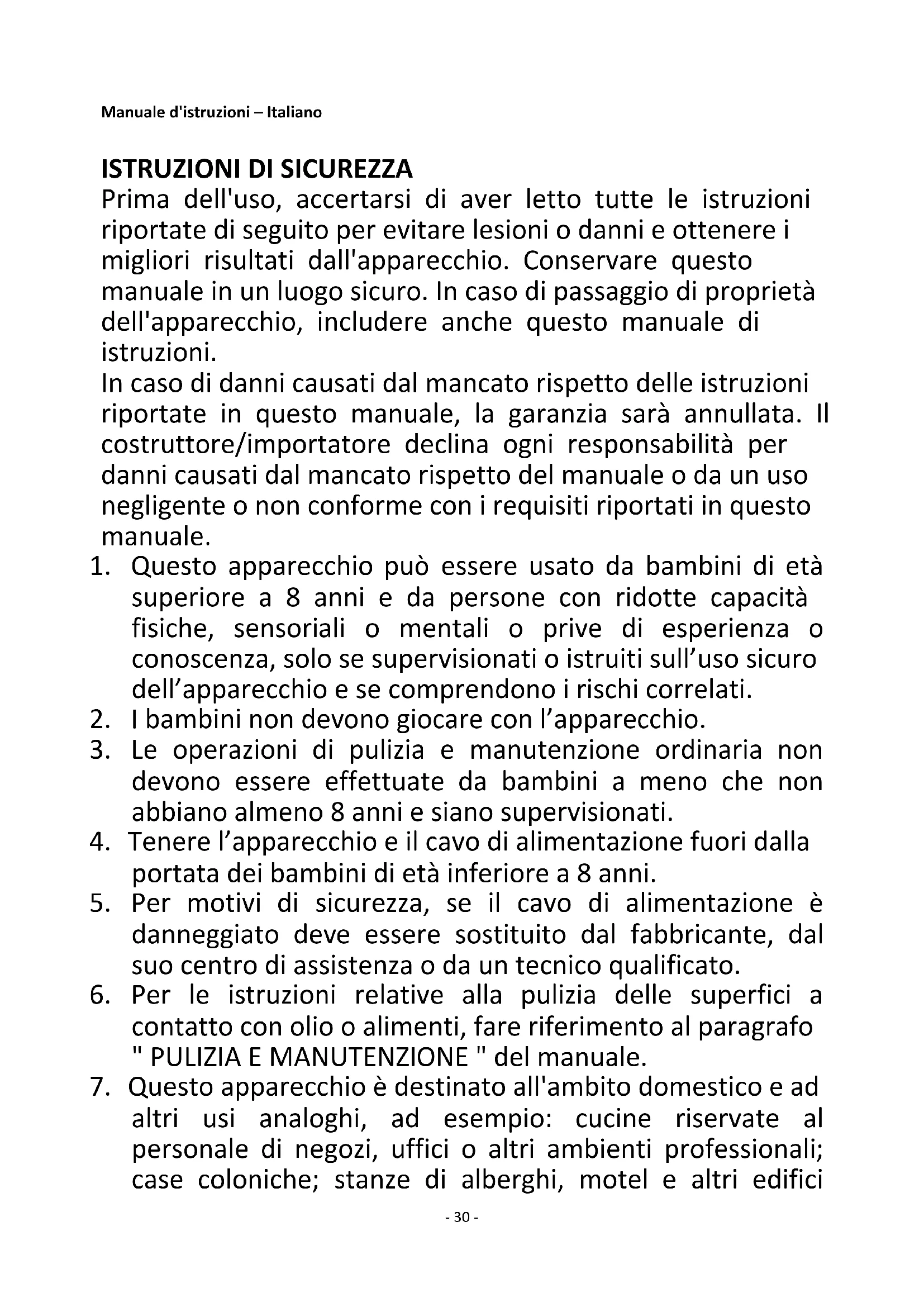 Prima dell'uso, accertarsi di aver letto tutte le istruzioni riportate di seguito per evitare lesioni o danni e ottenere i migliori risultati dall'apparecchio. Conservare questo manuale in un luogo sicuro. In caso di passaggio di proprietà dell'apparecchio, includere anche questo manuale di istruzioni. In caso di danni causati dal mancato rispetto delle istruzioni riportate in questo manuale, la garanzia sarà annullata. Il costruttore/importatore declina ogni responsabilità per danni causati dal mancato rispetto del manuale o da un uso negligente o non conforme con i requisiti riportati in questo manuale.
