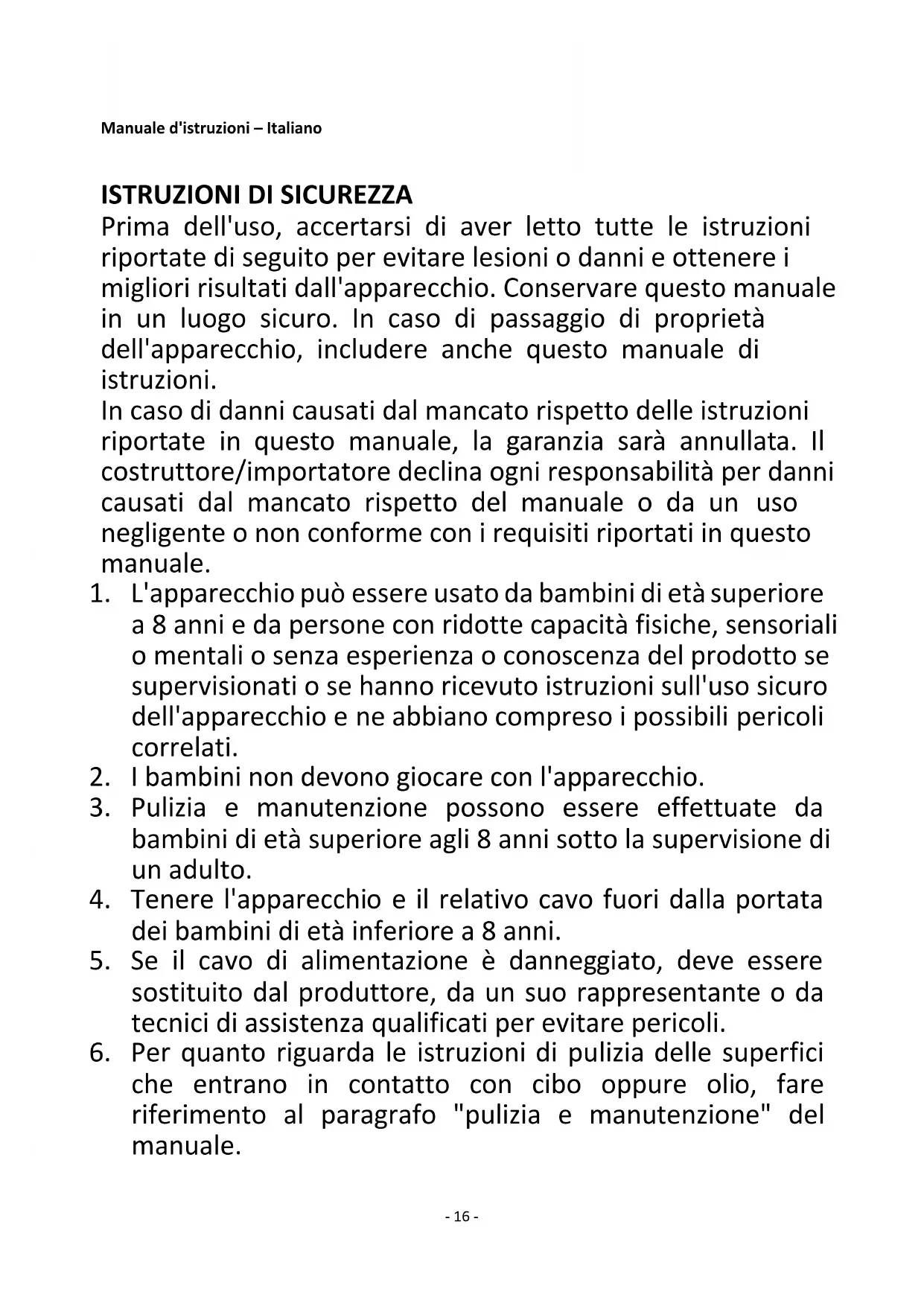 Prima dell'uso, accertarsi di aver letto tutte le istruzioni riportate di seguito per evitare lesioni o danni e ottenere i migliori risultati dall'apparecchio. Conservare questo manuale in un luogo sicuro. In caso di passaggio di proprietà dell'apparecchio, includere anche questo manuale di istruzioni. In caso di danni causati dal mancato rispetto delle istruzioni riportate in questo manuale, la garanzia sarà annullata. Il costruttore/importatore declina ogni responsabilità per danni causati dal mancato rispetto del manuale o da un uso negligente o non conforme con i requisiti riportati in questo manuale.