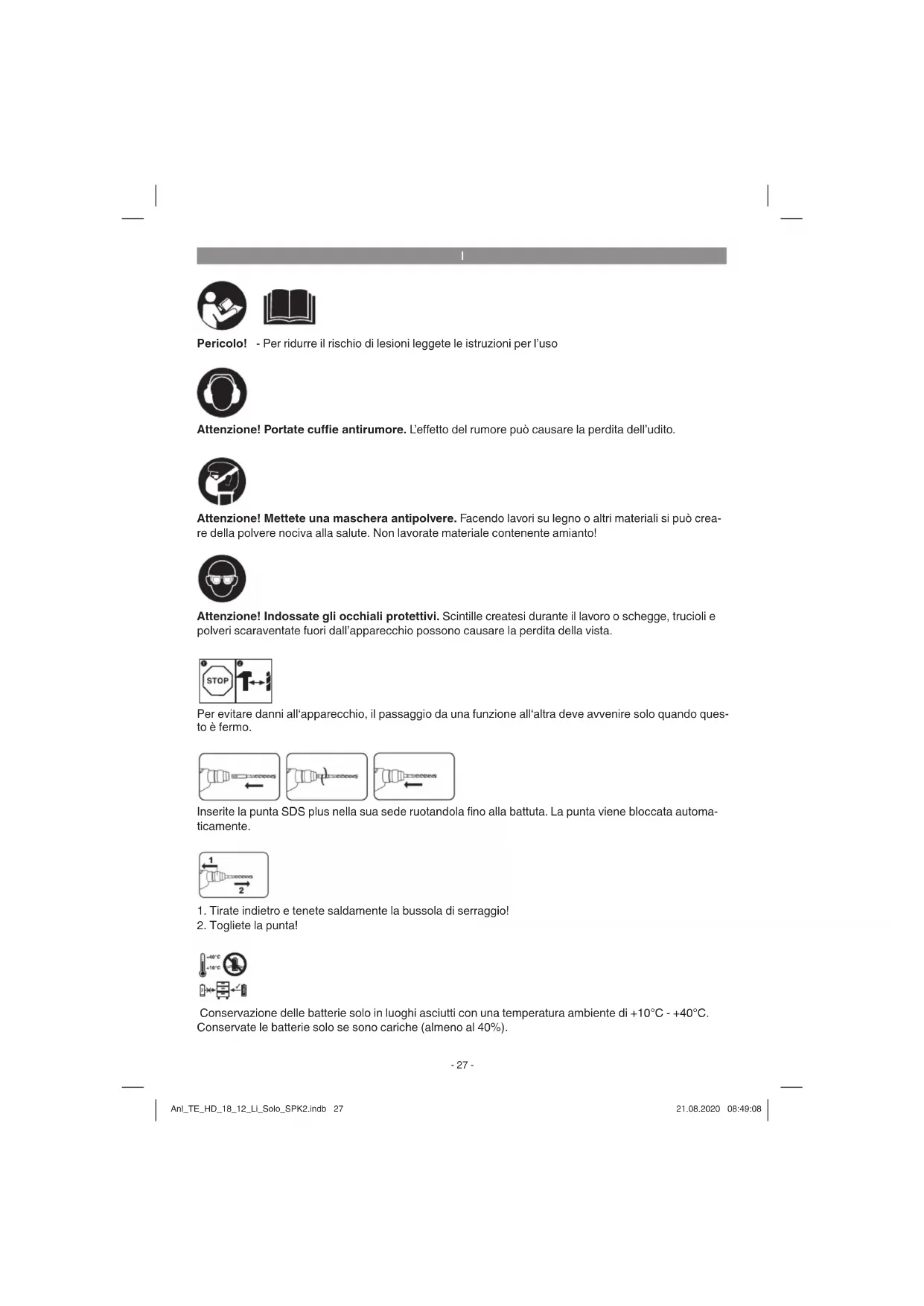 Pericolo! - Per ridurre il rischio di lesioni leggete le istruzioni per l’uso Attenzione! Portate cuffi e antirumore. L’e ff etto del rumore può causare la perdita dell’udito. Attenzione! Indossate gli occhiali protettivi. Scintille createsi durante il lavoro o schegge, trucioli e polveri scaraventate fuori dall’apparecchio possono causare la perdita della vista. Attenzione! Mettete una maschera antipolvere. Facendo lavori su legno o altri materiali si può crea- re della polvere nociva alla salute. Non lavorate materiale contenente amianto! Conservazione delle batterie solo in luoghi asciutti con una temperatura ambiente di +10°C - +40°C. Conservate le batterie solo se sono cariche (almeno al 40%). Per evitare danni all‘apparecchio, il passaggio da una funzione all‘altra deve avvenire solo quando ques- to è fermo. Inserite la punta SDS plus nella sua sede ruotandola fi no alla battuta. La punta viene bloccata automa- ticamente.