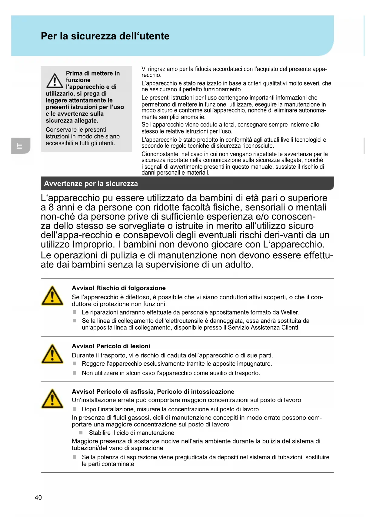 ltroprimariostadio microltropolveredellaclasse ltrocompatto stadio 2; 3 iltroperparticelleiltropergasaroniattivihemi- sor Interfaccia RS232 Mediante l‘interfaccia RS232 il sistema può essere azionato e/o controlla- to a distanza nella sua completa funzionalità Interfaccia interfacciaconsentedieffettuareaggiornamentidelrmaretest diefcienzaelogdidati IldispositivodeverestareinseritoperunmassimodiminutiIn seguitoilmoduloverrdisattivatoautomaticamente Dati Tecnici Garanzia I diritti di reclamo dell‘acquirente per eventuali difetti decadono dopo un anno dalla consegna. Tale condi- zionenonsiapplicaaidirittidirecessodellacuirentesecondo Il produttore risponde della garanzia fornita solo se la garanzia di qualità e di durata è stata fornita dal produt- toreperiscrittoeconlimpiegodelterminearanzia agaranziadecadrincasodiutilizzononconformeoualorapersonenonualicateaianoeffettuato interventi. Con riserva di modiche tecniche. Per ulteriori informazioni: www.weller-tools.com43