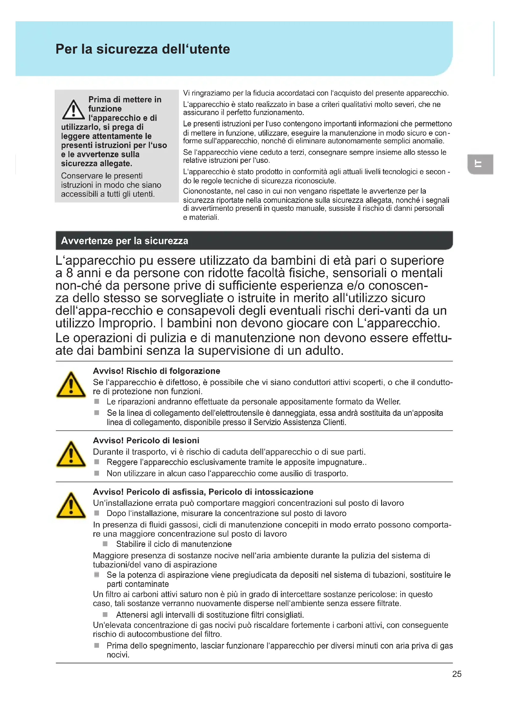 ate dai bambini senza la supervisione di un adulto. Avviso! Rischio di folgorazione Sel‘apparecchioèdifettoso,èpossibilechevisianoconduttoriattiviscoperti,ocheilcondutto- re di protezione non funzioni. Le riparazioni andranno effettuate da personale appositamente formato da Weller. Selalineadicollegamentodell‘elettroutensileèdanneggiata,essaandràsostituitadaun‘apposita lineadicollegamento,disponibilepressoilServizioAssistenzaClienti. Avviso! Pericolo di lesioni Duranteiltrasporto,vièrischiodicadutadell‘apparecchioodisueparti. Reggere l‘apparecchio esclusivamente tramite le apposite impugnature.. Non utilizzare in alcun caso l‘apparecchio come ausilio di trasporto. Avviso! Pericolo di asssia, Pericolo di intossicazione Un‘installazione errata può comportare maggiori concentrazioni sul posto di lavoro Dopol‘installazione,misurarelaconcentrazionesulpostodilavoro Inpresenzadiuidigassosi,ciclidimanutenzioneconcepitiinmodoerratopossonocomporta- re una maggiore concentrazione sul posto di lavoro Stabilire il ciclo di manutenzione Maggiore presenza di sostanze nocive nell‘aria ambiente durante la pulizia del sistema di tubazioni/delvanodiaspirazione Selapotenzadiaspirazionevienepregiudicatadadepositinelsistemaditubazioni,sostituirele parti contaminate Unltroaicarboniattivisaturononèpiùingradodiintercettaresostanzepericolose: inquesto caso,talisostanzeverrannonuovamentedispersenell‘ambientesenzaessereltrate. Attenersiagliintervallidisostituzioneltriconsigliati. Un‘elevataconcentrazionedigasnocivipuòriscaldarefortementeicarboniattivi,conconseguente rischiodiautocombustionedelltro. Primadellospegnimento,lasciarfunzionarel‘apparecchioperdiversiminuticonariaprivadigas nocivi.26