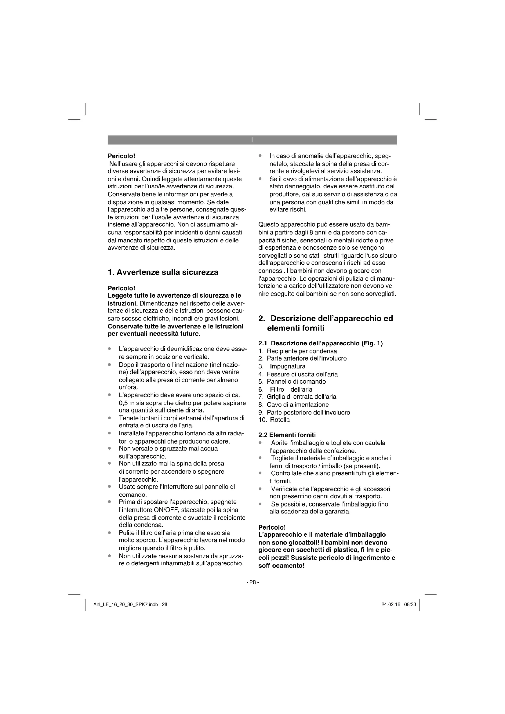 Il deumidifi catore è destinato solo alla deumi- difi cazione di locali per uso privato (per es. per locali giorno, notte, docce, magazzini, lavanderie o cantine). Avvertenza Il limite massimo di umidità dell’aria, al di là del quale le persone non hanno più una sensazione di benessere, è il 65%. Se fa molto caldo, la per- centuale di acqua è molto elevata - in altre parole l’umidità dell’aria è molto elevata. Tra l’umidità dell’aria e la temperatura esiste una determinata relazione. In generale si considera ideale per il benessere un’umidità dell’aria relativa del 35-65% a 21°C. In caso di temperatura ambiente al di sotto di 10°C o di un’umidità dell’aria dell’ambiente inferi- ore a 40% non conviene impiegare l’apparecchio. L’apparecchio deve venire usato solamente per lo scopo a cui è destinato. Ogni altro tipo di uso che esuli da quello previsto non è un uso conforme. L’utilizzatore/l’operatore, e non il costruttore, è responsabile dei danni e delle lesioni di ogni tipo che ne risultino. Tenete presente che i nostri apparecchi non sono stati costruiti per l’impiego professionale, artigi- anale o industriale. Non ci assumiamo alcuna garanzia quando l’apparecchio viene usato in imprese commerciali, artigianali o industriali, o in attività equivalenti.