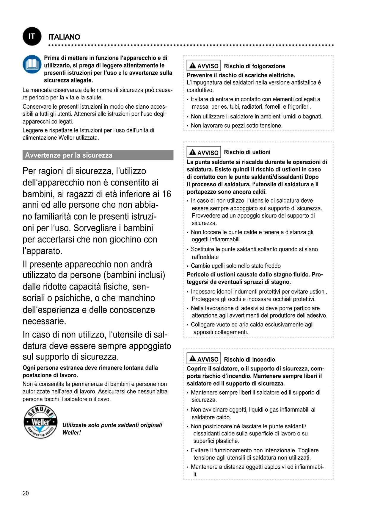datura deve essere sempre appoggiato sul supporto di sicurezza. Ogni persona estranea deve rimanere lontana dalla postazione di lavoro. Non è consentita la permanenza di bambini e persone non autorizzate nell‘area di lavoro. Assicurarsi che nessun’altra persona tocchi il saldatore o il cavo. Utilizzate solo punte saldanti originali Weller! AVVISO Rischio di folgorazione Prevenire il rischio di scariche elettriche. L’impugnatura dei saldatori nella versione antistatica è conduttivo.