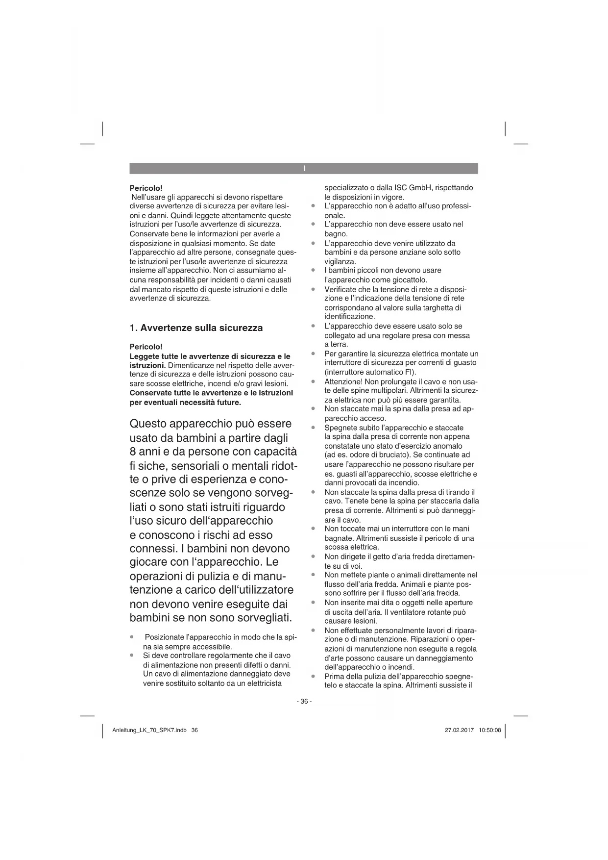 L‘apparecchio è adatto al raff reddamento dell‘aria dell‘ambiente in locali chiusi. A tale scopo l‘aria in uscita viene raff reddata dall‘acqua fredda che evapora dal relativo serbatoio dell‘apparecchio. L’apparecchio deve venire usato solamente per lo scopo a cui è destinato. Ogni altro tipo di uso che esuli da quello previsto non è un uso conforme. L’utilizzatore/l’operatore, e non il costruttore, è responsabile dei danni e delle lesioni di ogni tipo che ne risultino. Tenete presente che i nostri apparecchi non sono stati costruiti per l’impiego professionale, artigi- anale o industriale. Non ci assumiamo alcuna garanzia quando l’apparecchio viene usato in imprese commerciali, artigianali o industriali, o in attività equivalenti. Suggerimenti per il risparmio energetico Chiudete porte, fi nestre e tapparelle per impedire il più possibile l’irraggiamento solare. Anleitung_LK_70_SPK7.indb 37Anleitung_LK_70_SPK7.indb 37 27.02.2017 10:50:0827.02.2017 10:50:08I