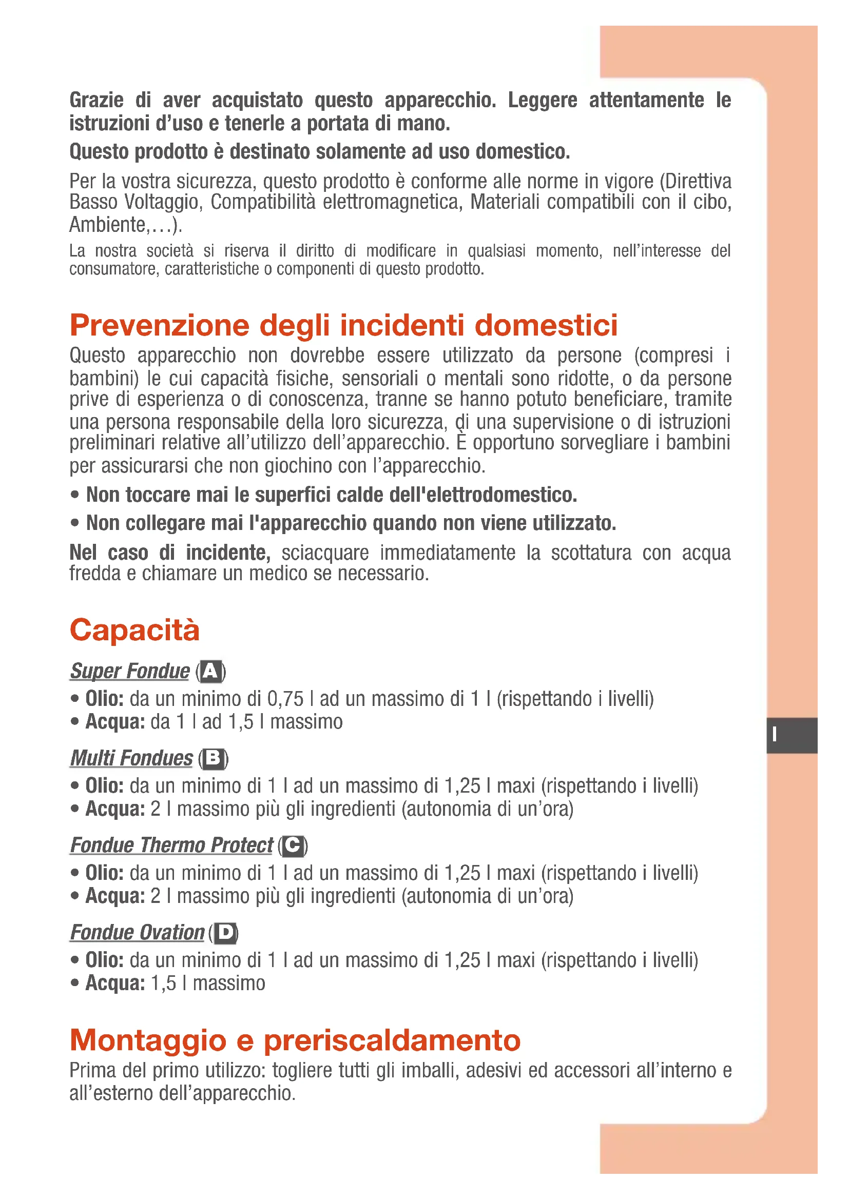 - Non collegare mai l'apparecchio quando non viene utilizzato. Nel caso di incidente, sciacquare immediatamente la scottatura con acqua fredda e chiamare un medico se necessario. Capacità Super Fondue