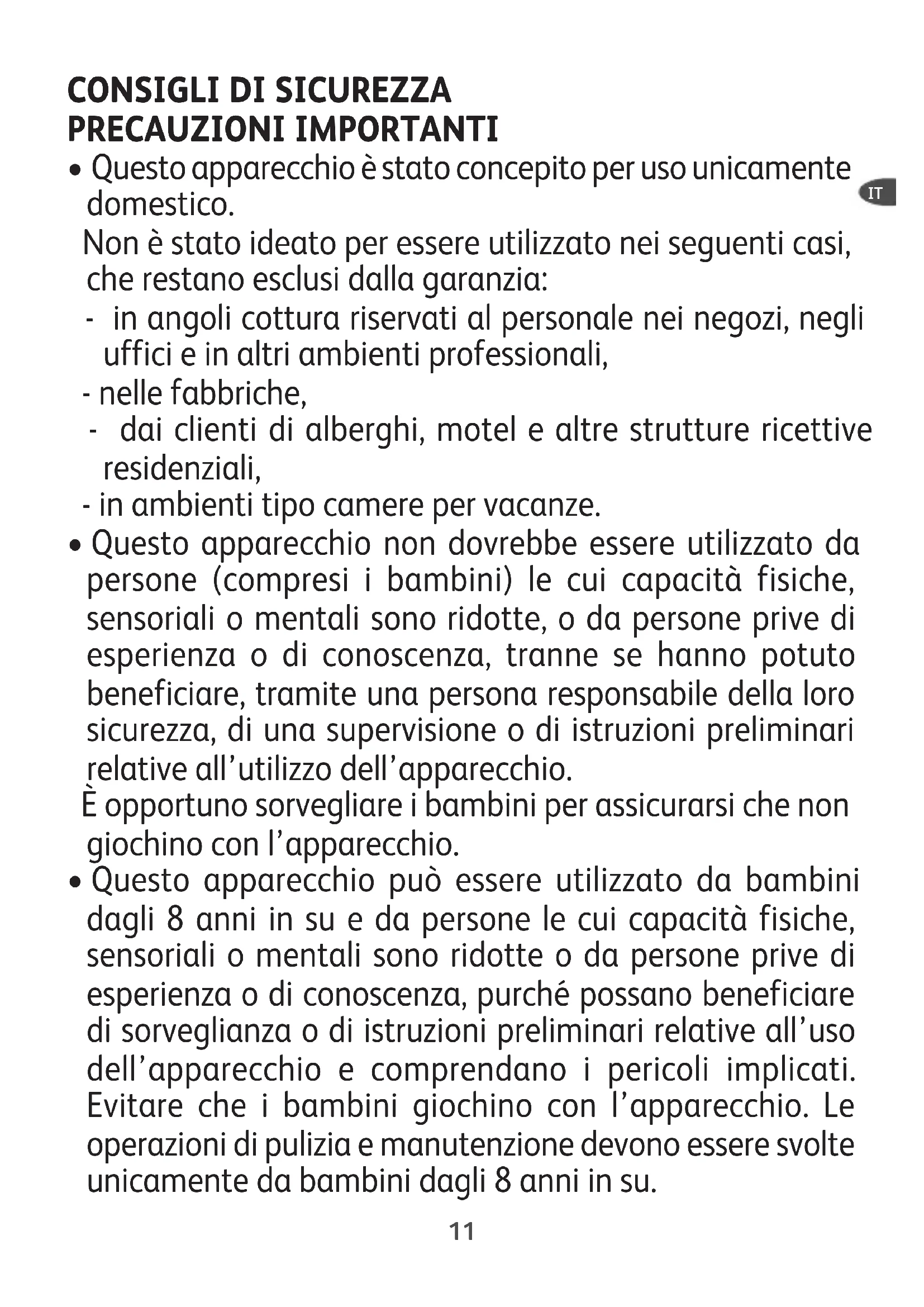 ITTenere l’apparecchio e il relativo cavo di alimentazione fuori della portata dei bambini di età inferiore agli 8 anni.