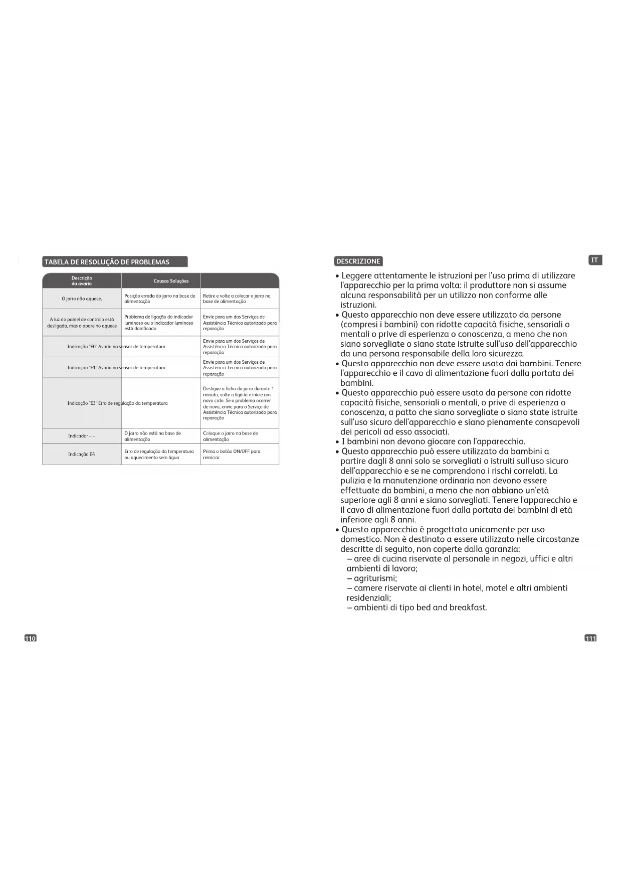 - Questo apparecchio è progettato unicamente per uso domestico. Non è destinato a essere utilizzato nelle circostanze descritte di seguito, non coperte dalla garanzia: – aree di cucina riservate al personale in negozi, uffici e altri ambienti di lavoro; – agriturismi; – camere riservate ai clienti in hotel, motel e altri ambienti residenziali; – ambienti di tipo bed and breakfast.113112