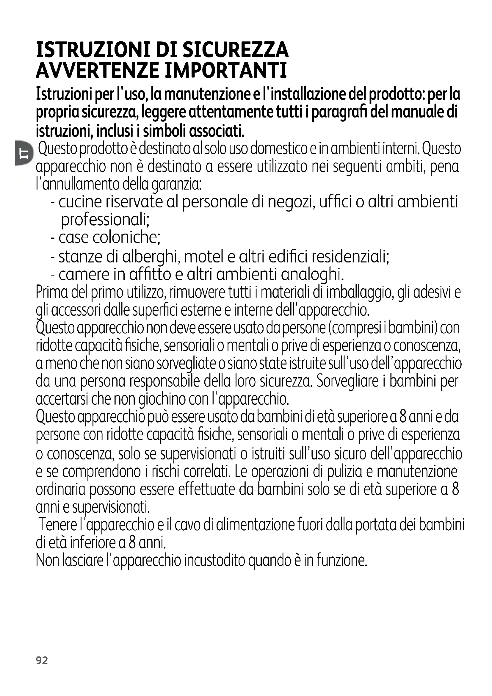 AVVERTENZE IMPORTANTI Istruzioni per l'uso, la manutenzione e l'installazione del prodotto: per la propria sicurezza, leggere attentamente tutti i paragrafi del manuale di istruzioni, inclusi i simboli associati. Questo prodotto è destinato al solo uso domestico e in ambienti interni. Questo apparecchio non è destinato a essere utilizzato nei seguenti ambiti, pena l’annullamento della garanzia: - cucine riservate al personale di negozi, uffici o altri ambienti professionali; - case coloniche; - stanze di alberghi, motel e altri edifici residenziali; - camere in affitto e altri ambienti analoghi. Prima del primo utilizzo, rimuovere tutti i materiali di imballaggio, gli adesivi e gli accessori dalle superfici esterne e interne dell'apparecchio. Questo apparecchio non deve essere usato da persone (compresi i bambini) con ridotte capacità fisiche, sensoriali o mentali o prive di esperienza o conoscenza, a meno che non siano sorvegliate o siano state istruite sull’uso dell’apparecchio da una persona responsabile della loro sicurezza. Sorvegliare i bambini per accertarsi che non giochino con l'apparecchio. Questo apparecchio può essere usato da bambini di età superiore a 8 anni e da persone con ridotte capacità fisiche, sensoriali o mentali o prive di esperienza o conoscenza, solo se supervisionati o istruiti sull’uso sicuro dell’apparecchio e se comprendono i rischi correlati. Le operazioni di pulizia e manutenzione ordinaria possono essere effettuate da bambini solo se di età superiore a 8 anni e supervisionati. Tenere l'apparecchio e il cavo di alimentazione fuori dalla portata dei bambini di età inferiore a 8 anni. Non lasciare l'apparecchio incustodito quando è in funzione.93