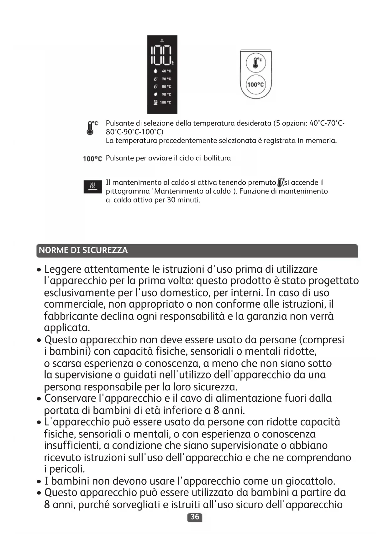 Pulsante di selezione della temperatura desiderata (5 opzioni: 40°C-70°C- 80°C-90°C-100°C) La temperatura precedentemente selezionata è registrata in memoria. Pulsante per avviare il ciclo di bollitura Il mantenimento al caldo si attiva tenendo premuto (siaccende il pittogramma 'Mantenimento al caldo'). Funzione di mantenimento al caldo attiva per 30 minuti.37 epienamente a conoscenza dei pericoli che comporta. La pulizia ela manutenzione non devono essere eseguite da bambini ameno che abbiano più di 8 anni e siano sorvegliati da un adulto.