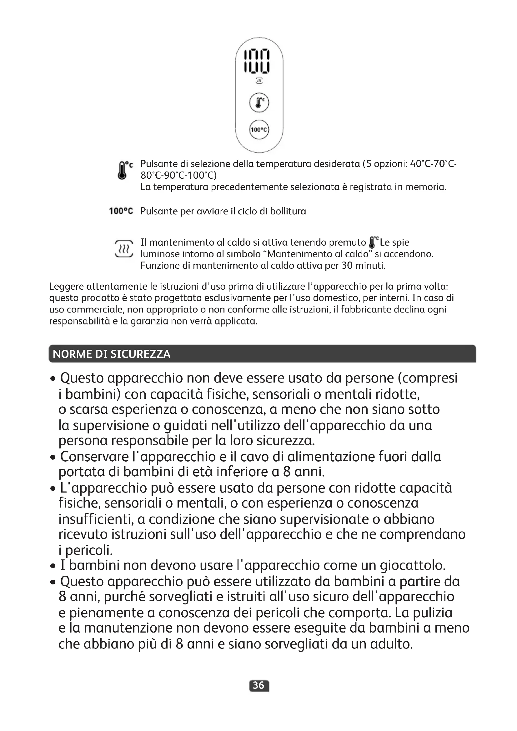 Leggere attentamente le istruzioni d’uso prima di utilizzare l’apparecchio per la prima volta: questo prodotto è stato progettato esclusivamente per l’uso domestico, per interni. In caso di uso commerciale, non appropriato o non conforme alle istruzioni, il fabbricante declina ogni responsabilità e la garanzia non verrà applicata. Pulsante di selezione della temperatura desiderata (5 opzioni: 40°C-70°C- 80°C-90°C-100°C) La temperatura precedentemente selezionata è registrata in memoria. Pulsante per avviare il ciclo di bollitura Il mantenimento al caldo si attiva tenendo premuto Le spie luminose intorno al simbolo “Mantenimento al caldo” si accendono. Funzione di mantenimento al caldo attiva per 30 minuti.37