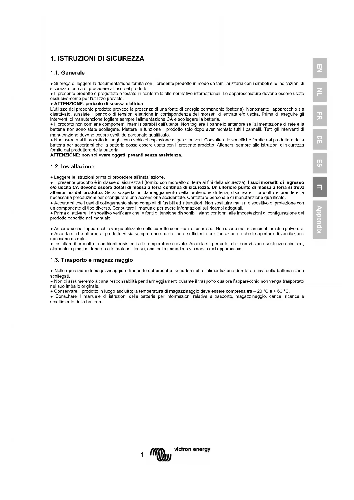 1.1. Generale ● Si prega di leggere la documentazione fornita con il presente prodotto in modo da familiarizzarsi con i simboli e le indicazioni di sicurezza, prima di procedere all'uso del prodotto. ● Il presente prodotto è progettato e testato in conformità alle normative internazionali. Le apparecchiature devono essere usate esclusivamente per l’utilizzo previsto. ● ATTENZIONE: pericolo di scossa elettrica L’utilizzo del presente prodotto prevede la presenza di una fonte di energia permanente (batteria). Nonostante l’apparecchio sia disattivato, sussiste il pericolo di tensioni elettriche in corrispondenza dei morsetti di entrata e/o uscita. Prima di eseguire gli interventi di manutenzione togliere sempre l'alimentazione CA e scollegare la batteria. ● Il prodotto non contiene componenti interni riparabili dall’utente. Non togliere il pannello anteriore se l'alimentazione di rete e la batteria non sono state scollegate. Mettere in funzione il prodotto solo dopo aver montato tutti i pannelli. Tutti gli interventi di manutenzione devono essere svolti da personale qualificato. ● Non usare mai il prodotto in luoghi con rischio di esplosione di gas o polveri. Consultare le specifiche fornite dal produttore della batteria per accertarsi che la batteria possa essere usata con il presente prodotto. Attenersi sempre alle istruzioni di sicurezza fornite dal produttore della batteria. ATTENZIONE: non sollevare oggetti pesanti senza assistenza. 1.2. Installazione ● Leggere le istruzioni prima di procedere all’installazione. ● Il presente prodotto è in classe di sicurezza I (fornito con morsetto di terra ai fini della sicurezza). I suoi morsetti di ingresso e/o uscita CA devono essere dotati di messa a terra continua di sicurezza. Un ulteriore punto di messa a terra si trova all’esterno del prodotto. Se si sospetta un danneggiamento della protezione di terra, disattivare il prodotto e prendere le necessarie precauzioni per scongiurare una accensione accidentale. Contattare personale di manutenzione qualificato. ● Accertarsi che i cavi di collegamento siano completi di fusibili ed interruttori. Non sostituire mai un dispositivo di protezione con un componente di tipo diverso. Consultare il manuale per avere informazioni sui ricambi adeguati. ● Prima di attivare il dispositivo verificare che le fonti di tensione disponibili siano conformi alle impostazioni di configurazione del prodotto descritte nel manuale. ● Accertarsi che l’apparecchio venga utilizzato nelle corrette condizioni di esercizio. Non usarlo mai in ambienti umidi o polverosi. ● Accertarsi che attorno al prodotto vi sia sempre uno spazio libero sufficiente per l’aerazione e che le aperture di ventilazione non siano ostruite. ● Installare il prodotto in ambienti resistenti alle temperature elevate. Accertarsi, pertanto, che non vi siano sostanze chimiche, elementi in plastica, tende o altri materiali tessili, ecc. nelle immediate vicinanze dell’apparecchio. 1.3. Trasporto e magazzinaggio ● Nelle operazioni di magazzinaggio o trasporto del prodotto, accertarsi che l’alimentazione di rete e i cavi della batteria siano scollegati. ● Non ci assumeremo alcuna responsabilità per danneggiamenti durante il trasporto qualora l’apparecchio non venga trasportato nel suo imballo originale. ● Conservare il prodotto in luogo asciutto; la temperatura di magazzinaggio deve essere compresa tra – 20 °C e + 60 °C. ● Consultare il manuale di istruzioni della batteria per informazioni relative a trasporto, magazzinaggio, carica, ricarica e smaltimento della batteria.2