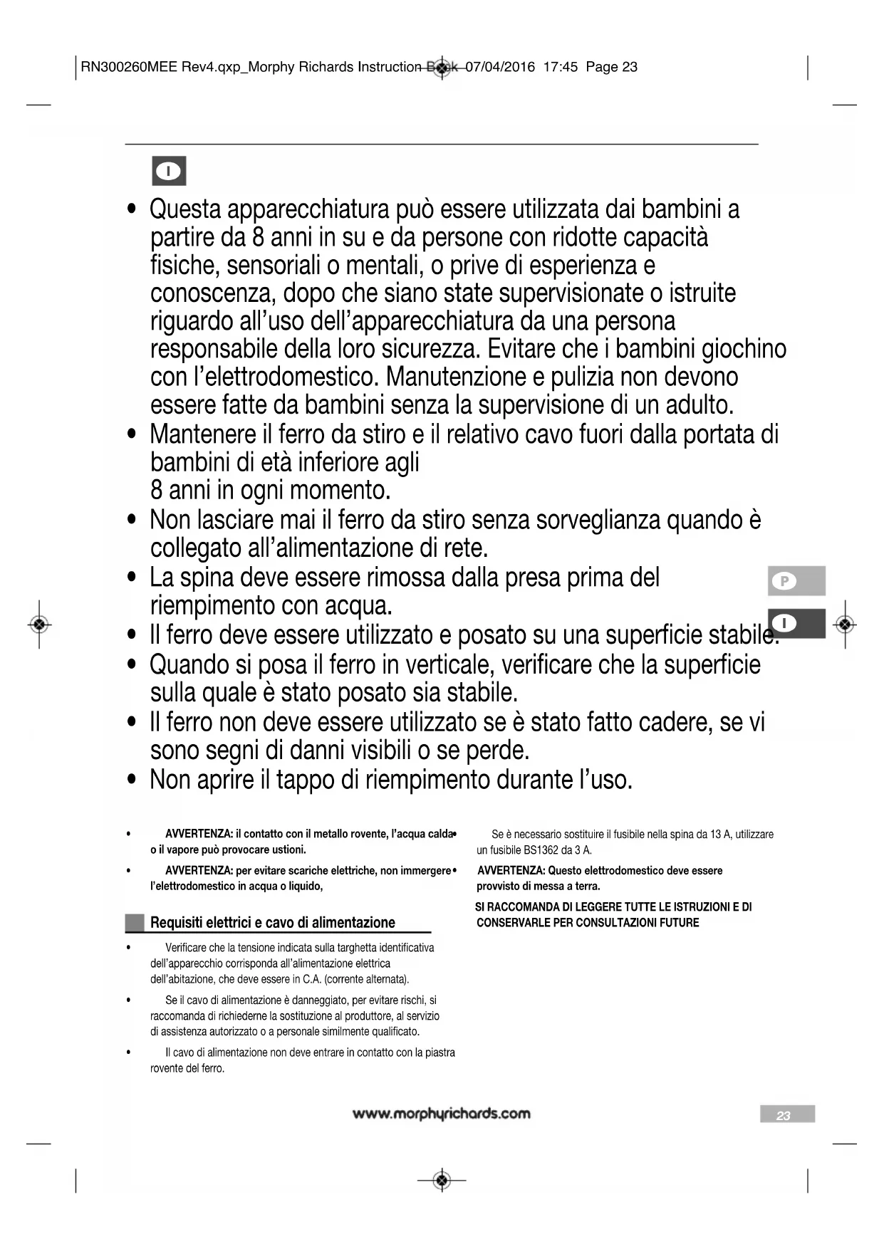 RN300260MEE Rev4.qxp_Morphy Richards Instruction Book 07/04/2016 17:45 Page 2526 8 Mentre il ferro è ancora molto caldo, tenerlo in posizione orizzontale sopra un lavandino. 9 Mantenendo ancora l’interruttore di regolazione vapore (1) nella posizione di autopulizia, spostare delicatamente il ferro avanti e indietro finché il serbatoio è vuoto. AVVERTENZA: Il vapore e l’acqua bollente usciranno dai fori della piastra. Questo lavaggio elimina il calcare e i minerali che si sono accumulati nella caldaia. 10 Quando la pulizia è completata, spostare l’interruttore di regolazione vapore nuovamente in posizione ‘O’. 11 Riportare il ferro in posizione verticale e attendere che si raffreddi. 12 Pulire la piastra (6) con un panno freddo, umido. Dopo l’operazione di pulizia, svuotare l’acqua residua. AVVERTENZA: tenere le mani e il corpo lontani dall’acqua calda. AVVERTENZA: non provare a disincrostare la piastra con prodotti disincrostanti. Contattateci Servizio di assistenza telefonica In caso di problemi col vostro elettrodomestico, vi invitiamo a contattare il nostro Servizio di assistenza telefonica, in quanto saremo in grado di fornirvi un’assistenza più mirata rispetto a quella fornita dal punto vendita. Vi consigliamo di tenere a portata di mano il nome del prodotto, il numero del modello e il numero di matricola per consentirci di gestire la vostra chiamata nel minor tempo possibile. Parlatene con noi Per eventuali domande o commenti, o semplicemente se volete dei suggerimenti per sfruttare al meglio il vostro elettrodomestico, seguiteci online: Blog: www.morphyrichards.co.uk/blog Facebook: www.facebook.com/morphyrichardsuk Twitter: www.twitter.com/loveyourmorphy Sito web: www.morphyrichards.com