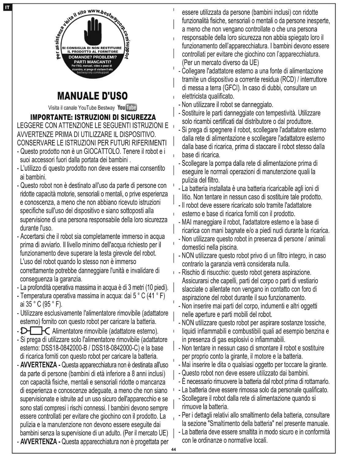 - Questo prodotto non è un GIOCATTOLO. Tenere il robot e i suoi accessori fuori dalla portata dei bambini . - L'utilizzo di questo prodotto non deve essere mai consentito ai bambini. - Questo robot non è destinato all'uso da parte di persone con ridotte capacità motorie, sensoriali o mentali, o prive esperienza e conoscenza, a meno che non abbiano ricevuto istruzioni specifiche sull'uso del dispositivo e siano sottoposti alla supervisione di una persona responsabile della loro sicurezza durante l'uso. - Accertarsi che il robot sia completamente immerso in acqua prima di avviarlo. Il livello minimo dell'acqua richiesto per il funzionamento deve superare la testa girevole del robot. L'uso del robot quando lo stesso non è immerso correttamente potrebbe danneggiare l'unità e invalidare di conseguenza la garanzia. - La profondità operativa massima in acqua è di 3 metri (10 piedi). - Temperatura operativa massima in acqua: dai 5 ° C (41 ° F) ai 35 ° C (95 ° F). - Utilizzare esclusivamente l'alimentatore rimovibile (adattatore esterno) fornito con questo robot per caricare la batteria. - Alimentatore rimovibile (adattatore esterno). - Si prega di utilizzare solo l'alimentatore rimovibile (adattatore esterno: DSS18-0842000-B / DSS18-0842000-C) e la base di ricarica forniti con questo robot per caricare la batteria. - AVVERTENZA - Questa apparecchiatura non è destinata all'uso da parte di persone (bambini di età inferiore a 8 anni inclusi) con capacità fisiche, mentali e sensoriali ridotte o mancanza di esperienza e conoscenze adeguate, a meno che non siano supervisionate e istruite ad un uso sicuro dell'apparecchio e se sono stati compresi i rischi connessi. I bambini devono sempre essere controllati per evitare che giochino con il prodotto. La pulizia e la manutenzione non devono essere eseguite dai bambini senza la supervisione di un adulto. (Per il mercato UE) - AVVERTENZA - Questa apparecchiatura non è progettata per essere utilizzata da persone (bambini inclusi) con ridotte funzionalità fisiche, sensoriali o mentali o da persone inesperte, a meno che non vengano controllate o che una persona responsabile della loro sicurezza non abbia spiegato loro il funzionamento dell’apparecchiatura. I bambini devono essere controllati per evitare che giochino con l’apparecchiatura. (Per un mercato diverso da UE) - Collegare l'adattatore esterno a una fonte di alimentazione tramite un dispositivo a corrente residua (RCD) / interruttore di messa a terra (GFCI). In caso di dubbi, consultare un elettricista qualificato. - Non utilizzare il robot se danneggiato. - Sostituire le parti danneggiate con tempestività. Utilizzare solo ricambi certificati dal distributore o dal produttore. - Si prega di spegnere il robot, scollegare l'adattatore esterno dalla rete di alimentazione e scollegare l'adattatore esterno dalla base di ricarica, prima di staccare il robot stesso dalla base di ricarica. - Scollegare la pompa dalla rete di alimentazione prima di eseguire le normali operazioni di manutenzione quali la pulizia del filtro. - La batteria installata è una batteria ricaricabile agli ioni di litio. Non tentare in nessun caso di sostituire tale prodotto. - Il robot deve essere ricaricato solo tramite l'adattatore esterno e base di ricarica forniti con il prodotto. - MAI maneggiare il robot, l'adattatore esterno e la base di ricarica con mani bagnate e/o a piedi nudi durante la ricarica. - Non utilizzare questo robot in presenza di persone / animali domestici nella piscina. - NON utilizzare questo robot privo di un filtro integro, in caso contrario la garanzia verrà considerata nulla. - Rischio di risucchio: questo robot genera aspirazione. Assicurarsi che capelli, parti del corpo o parti di vestiario slacciate o allentate non vengano in contatto con foro di aspirazione del robot durante il suo funzionamento. - Non inserire mai parti del corpo, indumenti e altri oggetti nelle aperture e parti mobili del robot. - NON utilizzare questo robot per aspirare sostanze tossiche, liquidi infiammabili e combustibili quali ad esempio benzina e in presenza di gas esplosivi o infiammabili. - Non tentare in nessun caso di smontare il robot e sostituire per proprio conto la girante, il motore e la batteria. - Mai inserire le dita o qualsiasi oggetto per toccare la girante. - Questo robot non deve essere utilizzato dai bambini. - È necessario rimuovere la batteria dal robot prima di rottamarlo. - La batteria deve essere rimossa solo da personale qualificato. - Scollegare il robot dalla rete di alimentazione quando si rimuove la batteria. - Per i dettagli relativi allo smaltimento della batteria, consultare la sezione "Smaltimento della batteria" nel presente manuale. - La batteria deve essere smaltita in modo sicuro e in conformità con le ordinanze o normative locali. - Il robot è dotato di una batteria ricaricabile agli ioni di litio che non richiede manutenzione e deve essere smaltita correttamente. Riciclaggio obbligatorio; si prega di contattare le autorità locali per ulteriori informazioni. - Adattatore esterno e base di ricarica: