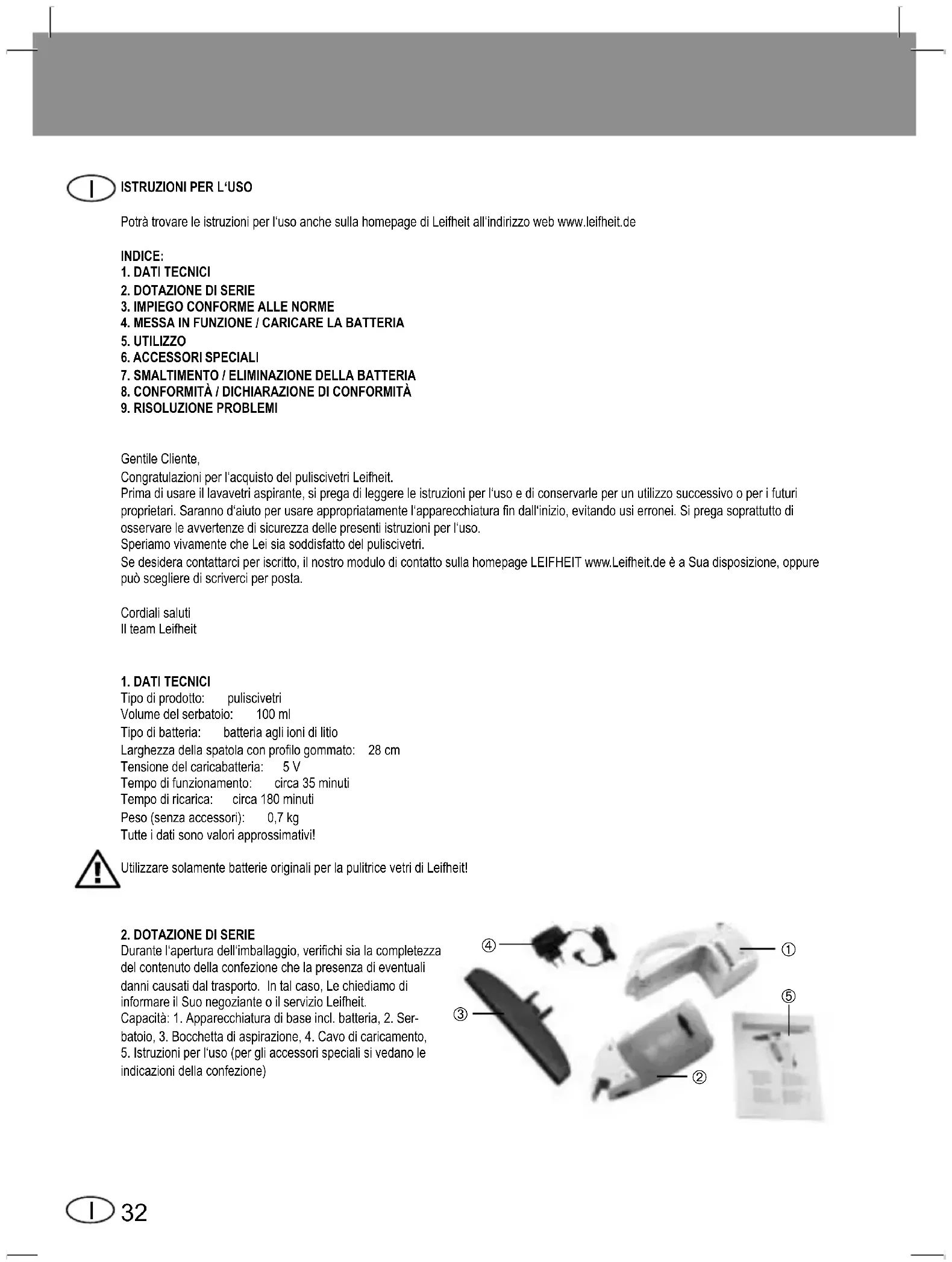 Gentile Cliente, Congratulazioni per l‘acquisto del puliscivetri Leifheit. Prima di usare il lavavetri aspirante, si prega di leggere le istruzioni per l‘uso e di conservarle per un utilizzo successivo o per i futuri proprietari.Sarannod‘aiutoperusareappropriatamentel‘apparecchiaturandall‘inizio,evitandousierronei.Sipregasoprattuttodi osservare le avvertenze di sicurezza delle presenti istruzioni per l‘uso. Speriamo vivamente che Lei sia soddisfatto del puliscivetri. Se desidera contattarci per iscritto, il nostro modulo di contatto sulla homepage LEIFHEIT www.Leifheit.de è a Sua disposizione, oppure può scegliere di scriverci per posta. Cordiali saluti Il team Leifheit