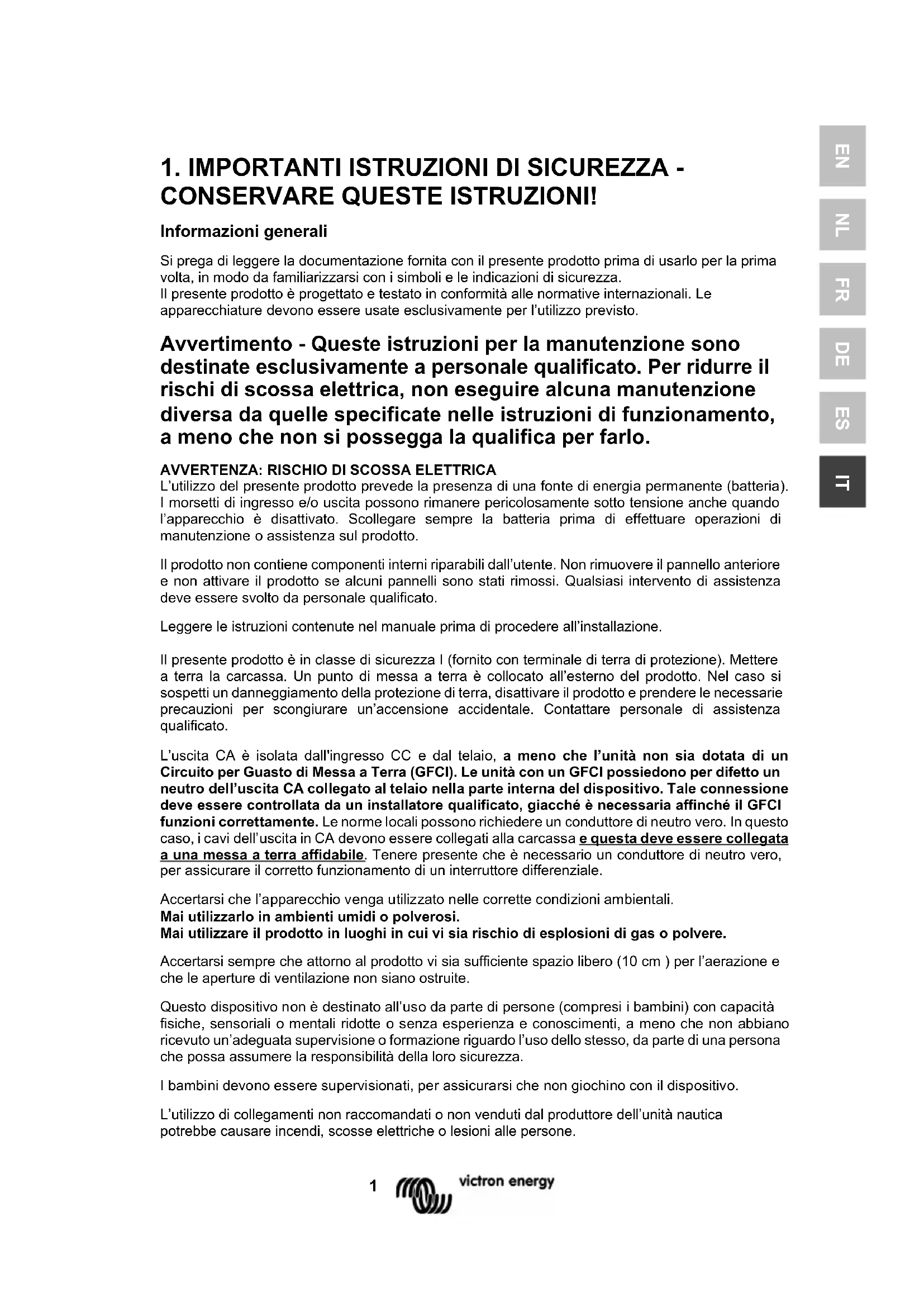 L’utilizzo del presente prodotto prevede la presenza di una fonte di energia permanente (batteria). I morsetti di ingresso e/o uscita possono rimanere pericolosamente sotto tensione anche quando l’apparecchio è disattivato. Scollegare sempre la batteria prima di effettuare operazioni di manutenzione o assistenza sul prodotto. Il prodotto non contiene componenti interni riparabili dall’utente. Non rimuovere il pannello anteriore e non attivare il prodotto se alcuni pannelli sono stati rimossi. Qualsiasi intervento di assistenza deve essere svolto da personale qualificato. Leggere le istruzioni contenute nel manuale prima di procedere all’installazione. Il presente prodotto è in classe di sicurezza I (fornito con terminale di terra di protezione). Mettere a terra la carcassa. Un punto di messa a terra è collocato all’esterno del prodotto. Nel caso si sospetti un danneggiamento della protezione di terra, disattivare il prodotto e prendere le necessarie precauzioni per scongiurare un’accensione accidentale. Contattare personale di assistenza qualificato. L’uscita CA è isolata dall'ingresso CC e dal telaio, a meno che l’unità non sia dotata di un Circuito per Guasto di Messa a Terra (GFCI). Le unità con un GFCI possiedono per difetto un neutro dell’uscita CA collegato al telaio nella parte interna del dispositivo. Tale connessione deve essere controllata da un installatore qualificato, giacché è necessaria affinché il GFCI funzioni correttamente. Le norme locali possono richiedere un conduttore di neutro vero. In questo caso, i cavi dell’uscita in CA devono essere collegati alla carcassa e questa deve essere collegata a una messa a terra affidabile. Tenere presente che è necessario un conduttore di neutro vero, per assicurare il corretto funzionamento di un interruttore differenziale. Accertarsi che l’apparecchio venga utilizzato nelle corrette condizioni ambientali. Mai utilizzarlo in ambienti umidi o polverosi. Mai utilizzare il prodotto in luoghi in cui vi sia rischio di esplosioni di gas o polvere. Accertarsi sempre che attorno al prodotto vi sia sufficiente spazio libero (10 cm ) per l’aerazione e che le aperture di ventilazione non siano ostruite. Questo dispositivo non è destinato all’uso da parte di persone (compresi i bambini) con capacità fisiche, sensoriali o mentali ridotte o senza esperienza e conoscimenti, a meno che non abbiano ricevuto un’adeguata supervisione o formazione riguardo l’uso dello stesso, da parte di una persona che possa assumere la responsibilità della loro sicurezza. I bambini devono essere supervisionati, per assicurarsi che non giochino con il dispositivo. L’utilizzo di collegamenti non raccomandati o non venduti dal produttore dell’unità nautica potrebbe causare incendi, scosse elettriche o lesioni alle persone.2