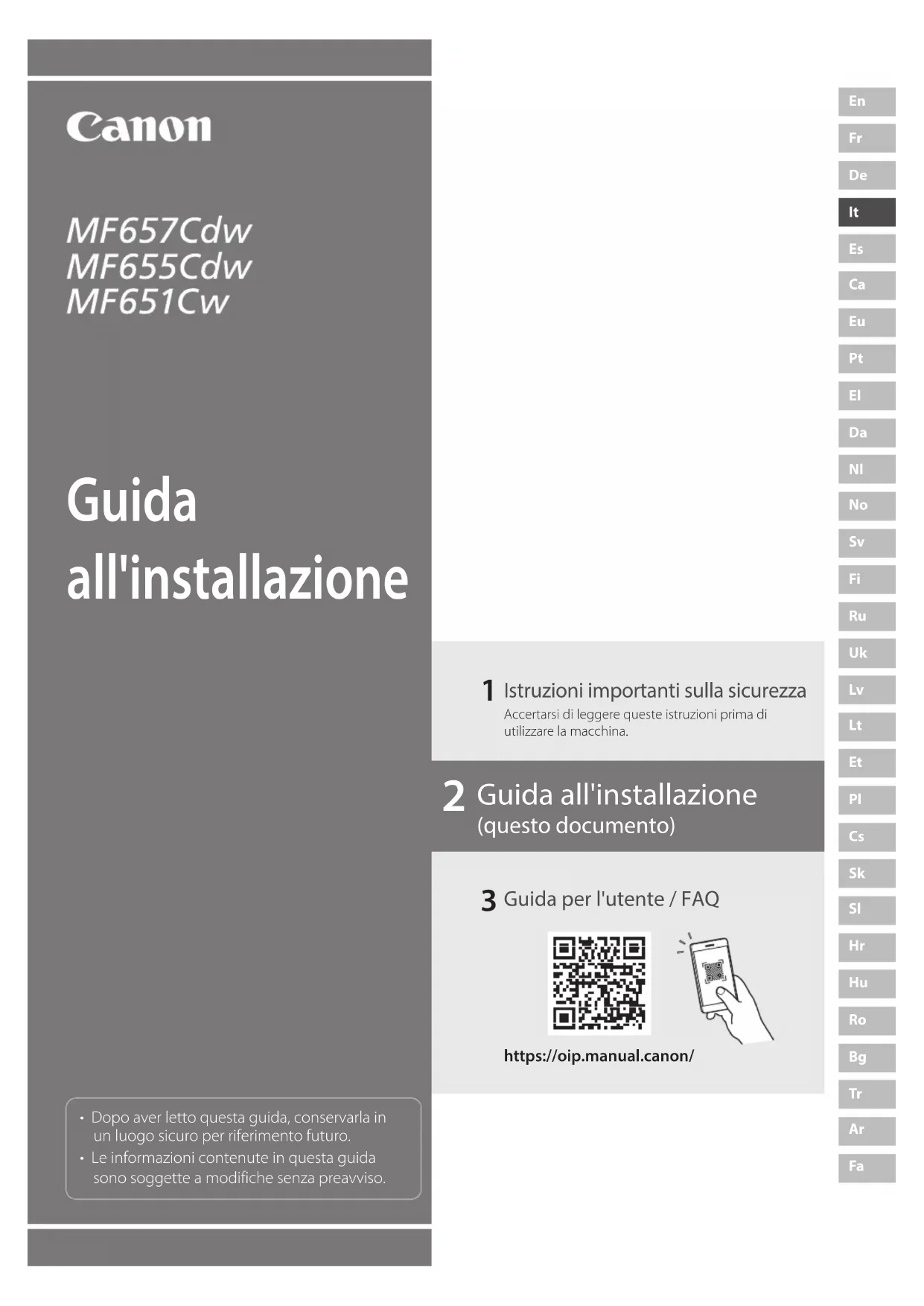 - Dopo aver letto questa guida, conservarla in un luogo sicuro per riferimento futuro.• Le informazioni contenute in questa guida sono soggette a modifiche senza preavviso.https://oip.manual.canon/ Istruzioni importanti sulla sicurezzaAccertarsi di leggere queste istruzioni prima di utilizzare la macchina. Guida per l'utente / FAQ