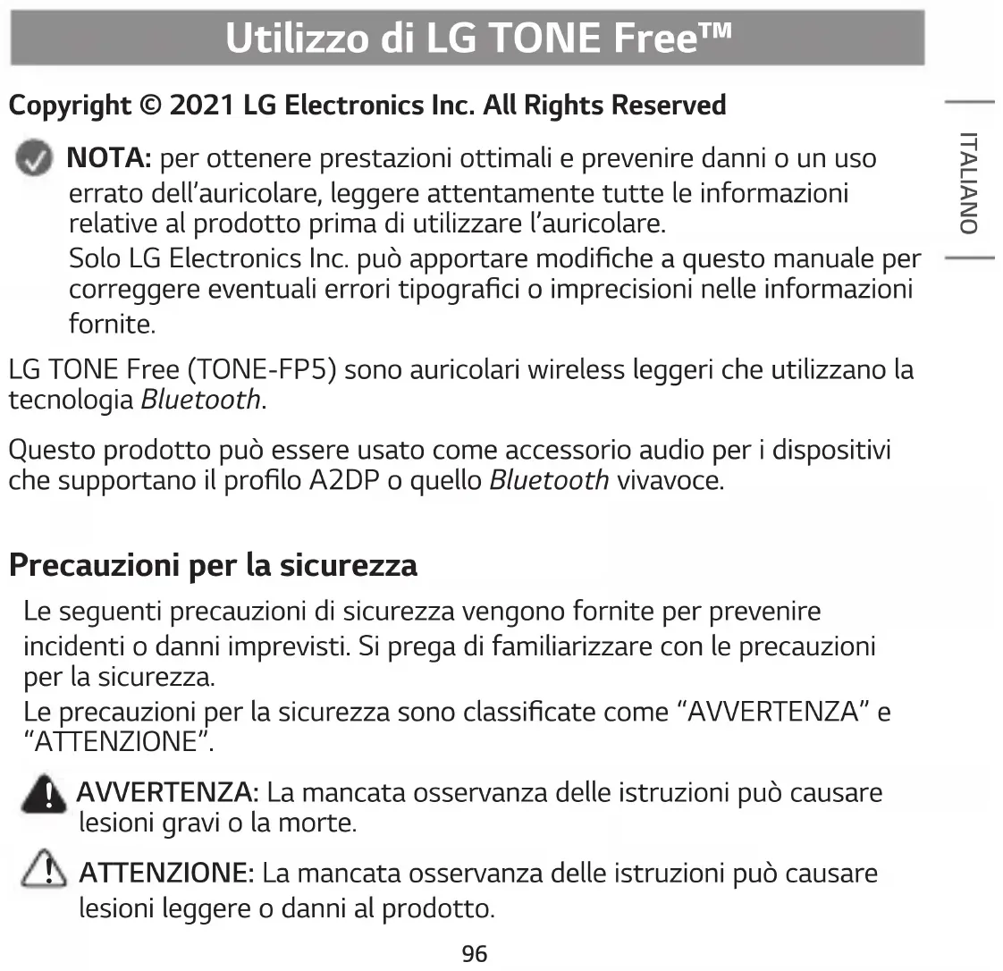 Copyright © 2021 LG Electronics Inc. All Rights Reserved NOTA: per ottenere prestazioni ottimali e prevenire danni o un uso errato dell’auricolare, leggere attentamente tutte le informazioni relative al prodotto prima di utilizzare l’auricolare. Solo LG Electronics Inc. può apportare modiche a questo manuale per correggere eventuali errori tipograci o imprecisioni nelle informazioni fornite. LG TONE Free (TONE-FP5) sono auricolari wireless leggeri che utilizzano la tecnologia Bluetooth. Questo prodotto può essere usato come accessorio audio per i dispositivi che supportano il prolo A2DP o quello Bluetooth vivavoce. Precauzioni per la sicurezza Le seguenti precauzioni di sicurezza vengono fornite per prevenire incidenti o danni imprevisti. Si prega di familiarizzare con le precauzioni per la sicurezza. Le precauzioni per la sicurezza sono classicate come “AVVERTENZA” e “ATTENZIONE”.