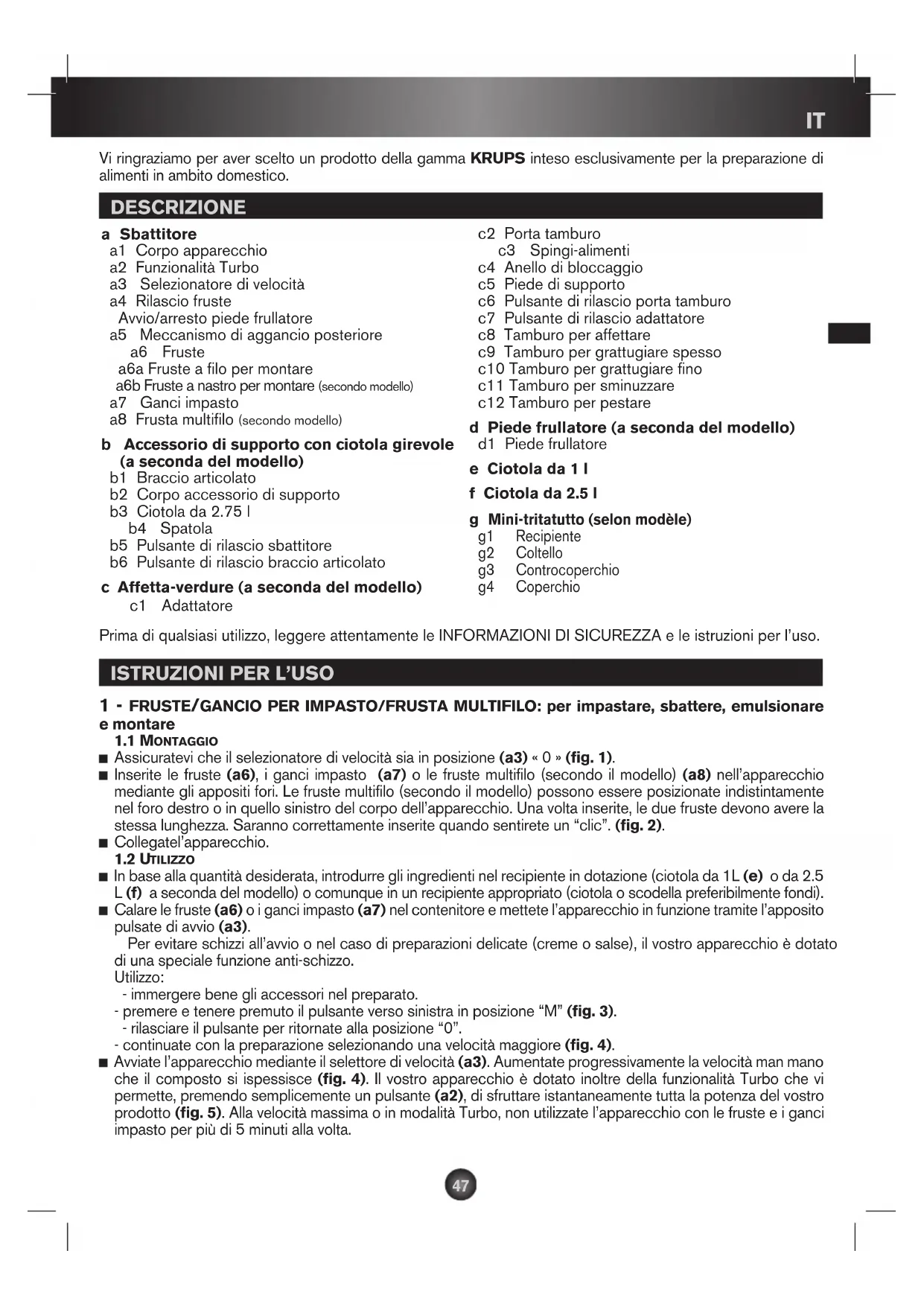 Vi ringraziamo per aver scelto un prodotto della gamma KRUPS inteso esclusivamente per la preparazione di alimenti in ambito domestico. DESCRIZIONE a Sbattitore a1 Corpo apparecchio a2 Funzionalità Turbo a3 Selezionatore di velocità a4 Rilascio fruste Avvio/arresto piede frullatore a5 Meccanismo di aggancio posteriore a6 Fruste a6a Fruste a filo per montare a6b Fruste a nastro per montare (secondo modello) a7 Ganci impasto a8 Frusta multifilo (secondo modello) b Accessorio di supporto con ciotola girevole (a seconda del modello) b1 Braccio articolato b2 Corpo accessorio di supporto b3 Ciotola da 2.75 l b4 Spatola b5 Pulsante di rilascio sbattitore b6 Pulsante di rilascio braccio articolato c Affetta-verdure (a seconda del modello) c1 Adattatore c2 Porta tamburo c3 Spingi-alimenti c4 Anello di bloccaggio c5 Piede di supporto c6 Pulsante di rilascio porta tamburo c7 Pulsante di rilascio adattatore c8 Tamburo per affettare c9 Tamburo per grattugiare spesso c10 Tamburo per grattugiare fino c11 Tamburo per sminuzzare c12 Tamburo per pestare d Piede frullatore (a seconda del modello) d1 Piede frullatore e Ciotola da 1 l f Ciotola da 2.5 l
