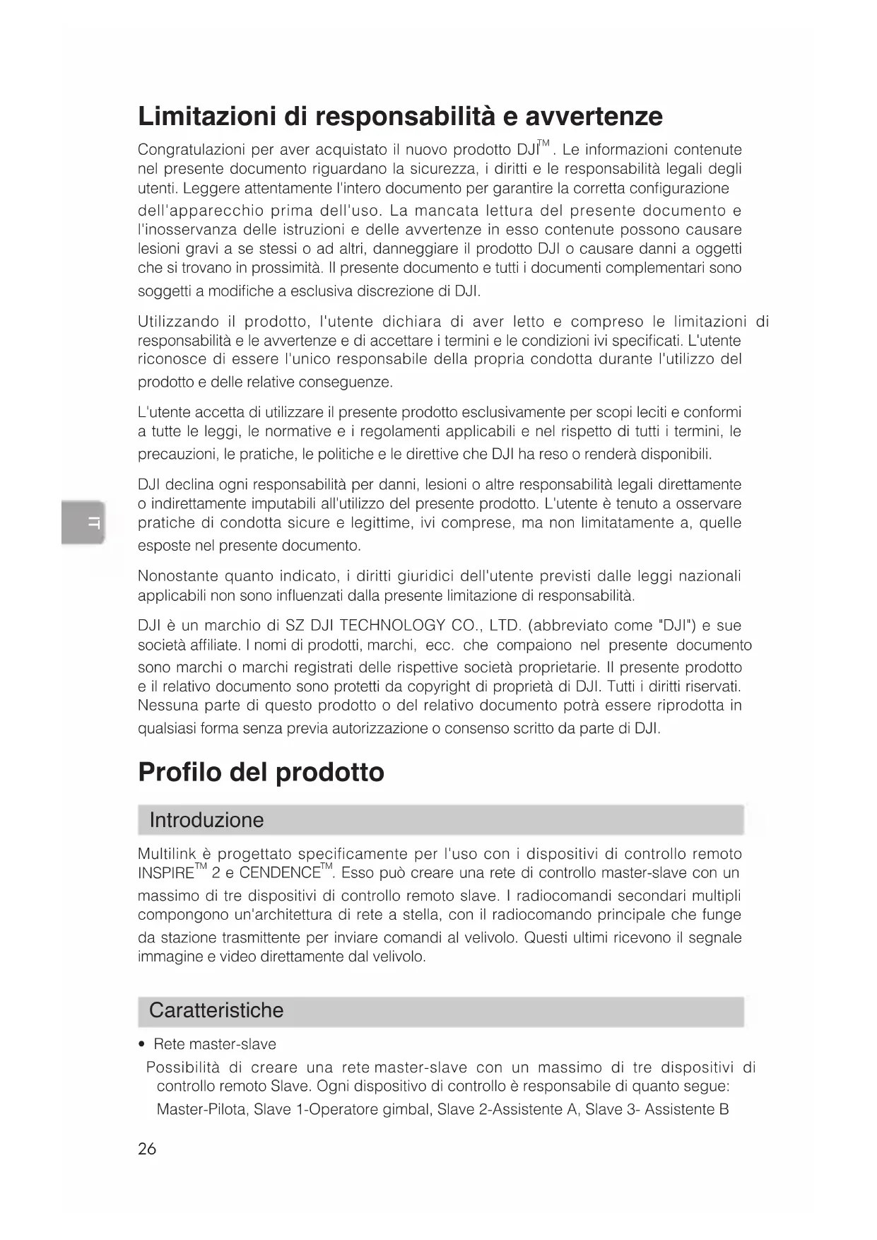 . Le informazioni contenute nel presente documento riguardano la sicurezza, i diritti e le responsabilità legali degli utenti. Leggere attentamente l'intero documento per garantire la corretta congurazione dell'apparecchio prima dell'uso. La mancata lettura del presente documento e l'inosservanza delle istruzioni e delle avvertenze in esso contenute possono causare lesioni gravi a se stessi o ad altri, danneggiare il prodotto DJI o causare danni a oggetti che si trovano in prossimità. Il presente documento e tutti i documenti complementari sono soggetti a modiche a esclusiva discrezione di DJI. Utilizzando il prodotto, l'utente dichiara di aver letto e compreso le limitazioni di responsabilità e le avvertenze e di accettare i termini e le condizioni ivi specicati. L'utente riconosce di essere l'unico responsabile della propria condotta durante l'utilizzo del prodotto e delle relative conseguenze. L'utente accetta di utilizzare il presente prodotto esclusivamente per scopi leciti e conformi a tutte le leggi, le normative e i regolamenti applicabili e nel rispetto di tutti i termini, le precauzioni, le pratiche, le politiche e le direttive che DJI ha reso o renderà disponibili. DJI declina ogni responsabilità per danni, lesioni o altre responsabilità legali direttamente o indirettamente imputabili all'utilizzo del presente prodotto. L'utente è tenuto a osservare pratiche di condotta sicure e legittime, ivi comprese, ma non limitatamente a, quelle esposte nel presente documento. Nonostante quanto indicato, i diritti giuridici dell'utente previsti dalle leggi nazionali applicabili non sono inuenzati dalla presente limitazione di responsabilità. DJI è un marchio di SZ DJI TECHNOLOGY CO., LTD. (abbreviato come "DJI") e sue società afliate. I nomi di prodotti, marchi, ecc. che compaiono nel presente documento sono marchi o marchi registrati delle rispettive società proprietarie. Il presente prodotto e il relativo documento sono protetti da copyright di proprietà di DJI. Tutti i diritti riservati. Nessuna parte di questo prodotto o del relativo documento potrà essere riprodotta in qualsiasi forma senza previa autorizzazione o consenso scritto da parte di DJI. Prolo del prodotto Introduzione Multilink è progettato specificamente per l'uso con i dispositivi di controllo remoto INSPIRE
