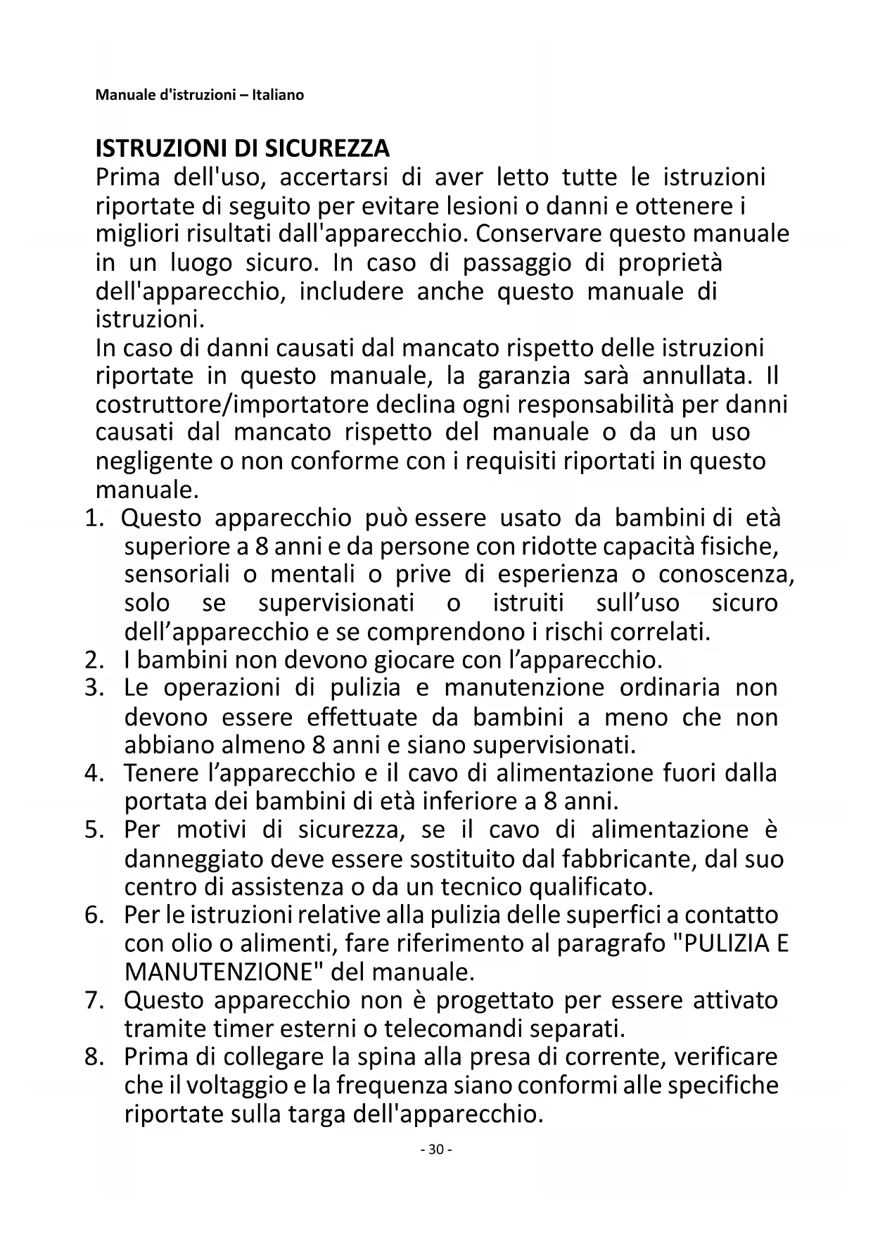 Prima dell'uso, accertarsi di aver letto tutte le istruzioni riportate di seguito per evitare lesioni o danni e ottenere i migliori risultati dall'apparecchio. Conservare questo manuale in un luogo sicuro. In caso di passaggio di proprietà dell'apparecchio, includere anche questo manuale di istruzioni. In caso di danni causati dal mancato rispetto delle istruzioni riportate in questo manuale, la garanzia sarà annullata. Il costruttore/importatore declina ogni responsabilità per danni causati dal mancato rispetto del manuale o da un uso negligente o non conforme con i requisiti riportati in questo manuale.
