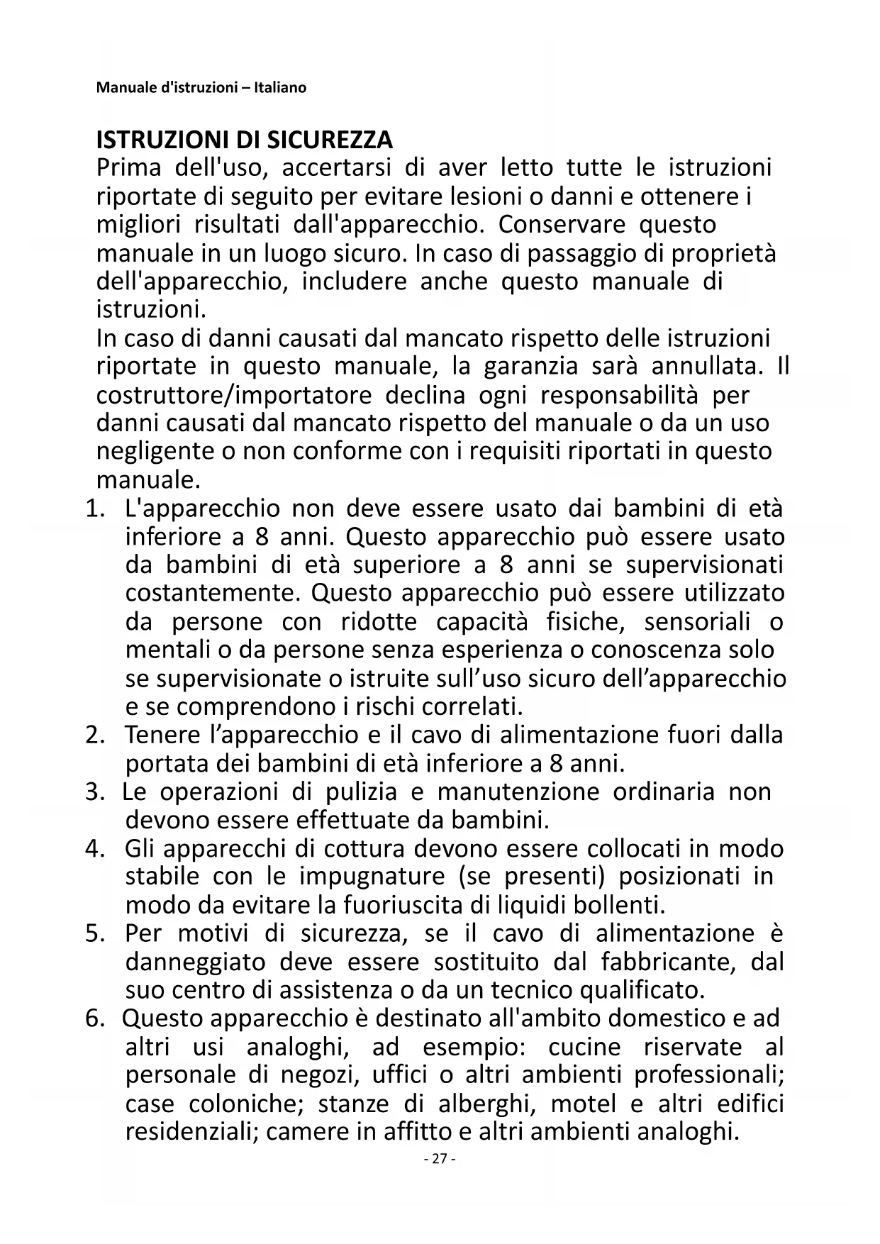 Prima dell'uso, accertarsi di aver letto tutte le istruzioni riportate di seguito per evitare lesioni o danni e ottenere i migliori risultati dall'apparecchio. Conservare questo manuale in un luogo sicuro. In caso di passaggio di proprietà dell'apparecchio, includere anche questo manuale di istruzioni. In caso di danni causati dal mancato rispetto delle istruzioni riportate in questo manuale, la garanzia sarà annullata. Il costruttore/importatore declina ogni responsabilità per danni causati dal mancato rispetto del manuale o da un uso negligente o non conforme con i requisiti riportati in questo manuale.