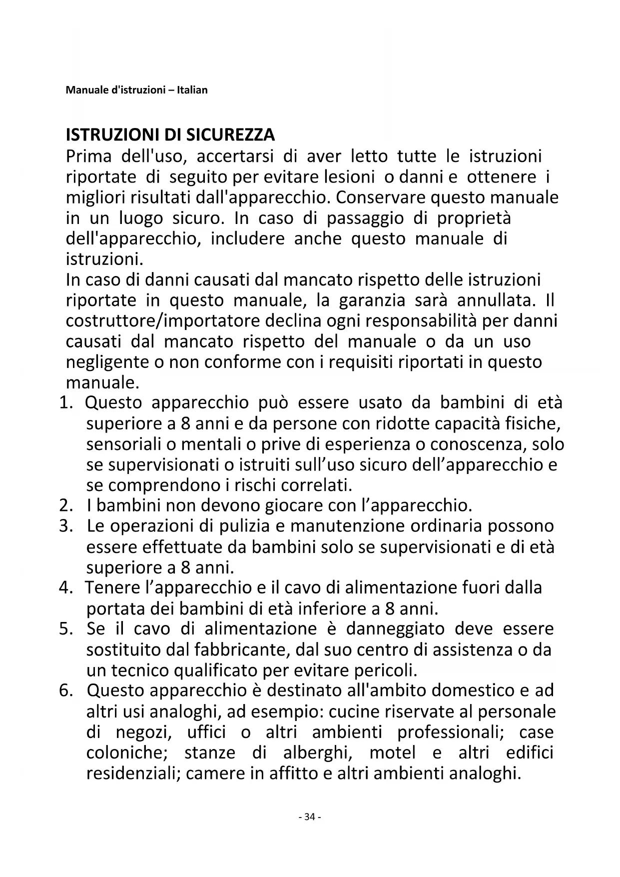 Prima dell'uso, accertarsi di aver letto tutte le istruzioni riportate di seguito per evitare lesioni o danni e ottenere i migliori risultati dall'apparecchio. Conservare questo manuale in un luogo sicuro. In caso di passaggio di proprietà dell'apparecchio, includere anche questo manuale di istruzioni. In caso di danni causati dal mancato rispetto delle istruzioni riportate in questo manuale, la garanzia sarà annullata. Il costruttore/importatore declina ogni responsabilità per danni causati dal mancato rispetto del manuale o da un uso negligente o non conforme con i requisiti riportati in questo manuale.