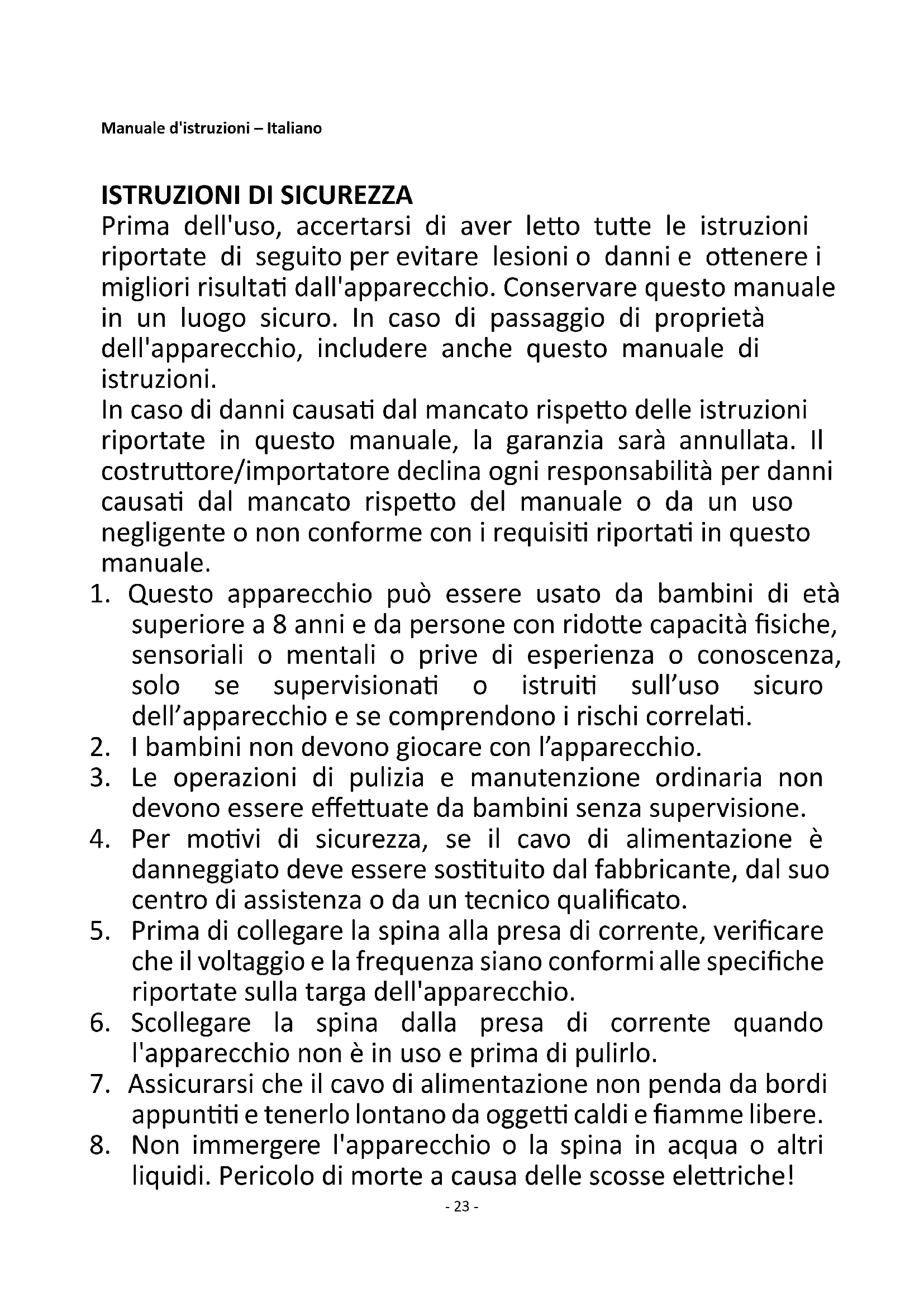 Prima dell'uso, accertarsi di aver letto tutte le istruzioni riportate di seguito per evitare lesioni o danni e ottenere i migliori risultati dall'apparecchio. Conservare questo manuale in un luogo sicuro. In caso di passaggio di proprietà dell'apparecchio, includere anche questo manuale di istruzioni. In caso di danni causati dal mancato rispetto delle istruzioni riportate in questo manuale, la garanzia sarà annullata. Il costruttore/importatore declina ogni responsabilità per danni causati dal mancato rispetto del manuale o da un uso negligente o non conforme con i requisiti riportati in questo manuale.