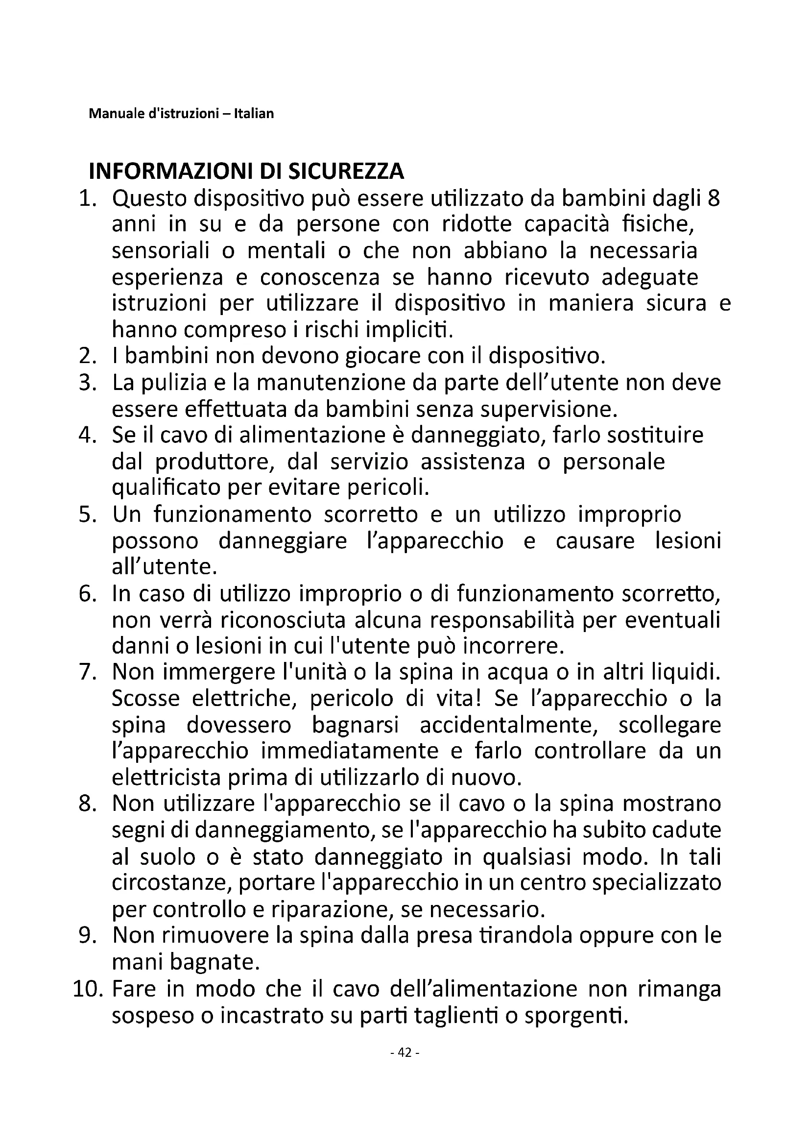 8. Non utilizzare l'apparecchio se il cavo o la spina mostrano