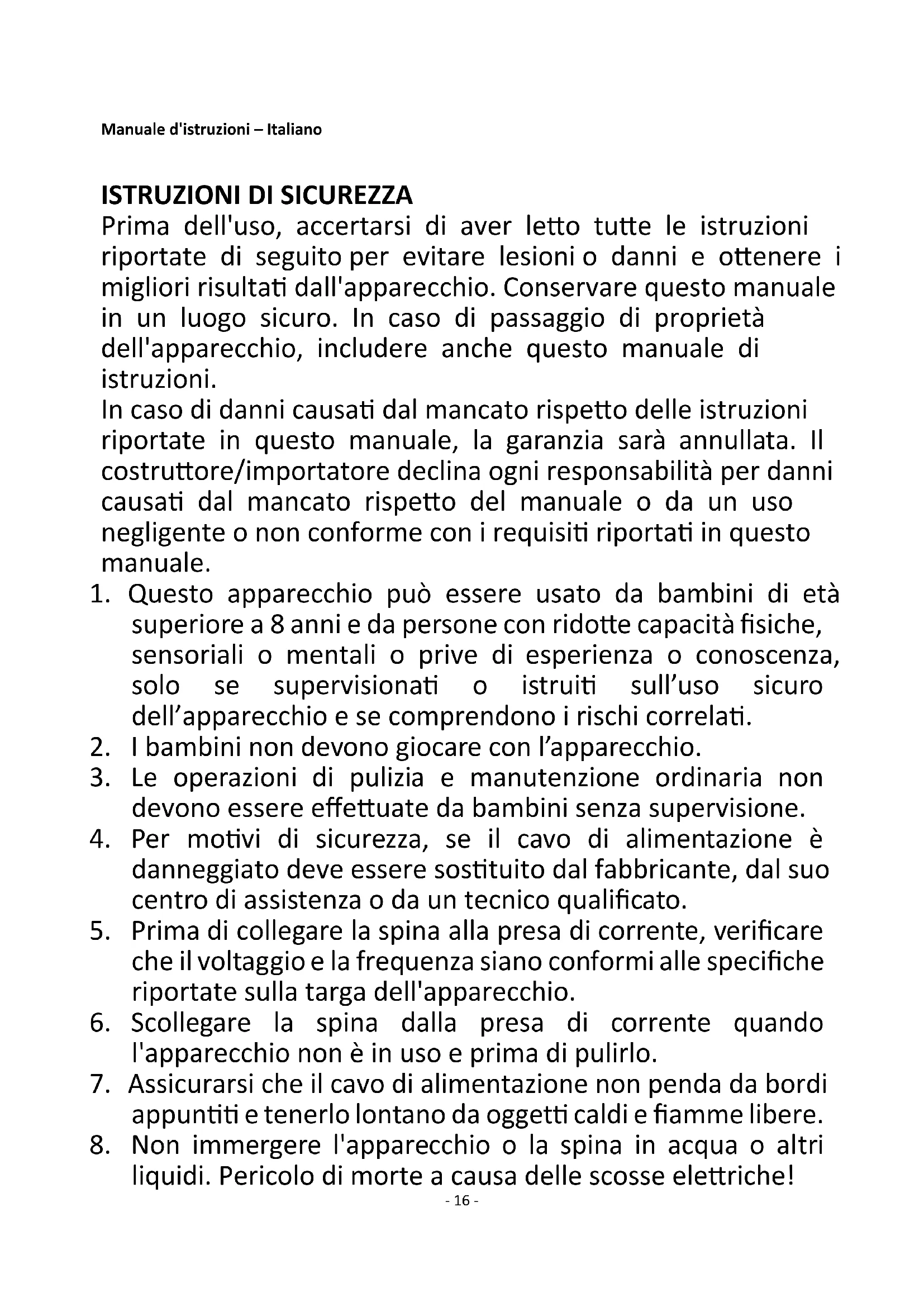 Prima dell'uso, accertarsi di aver letto tutte le istruzioni riportate di seguito per evitare lesioni o danni e ottenere i migliori risultati dall'apparecchio. Conservare questo manuale in un luogo sicuro. In caso di passaggio di proprietà dell'apparecchio, includere anche questo manuale di istruzioni. In caso di danni causati dal mancato rispetto delle istruzioni riportate in questo manuale, la garanzia sarà annullata. Il costruttore/importatore declina ogni responsabilità per danni causati dal mancato rispetto del manuale o da un uso negligente o non conforme con i requisiti riportati in questo manuale.