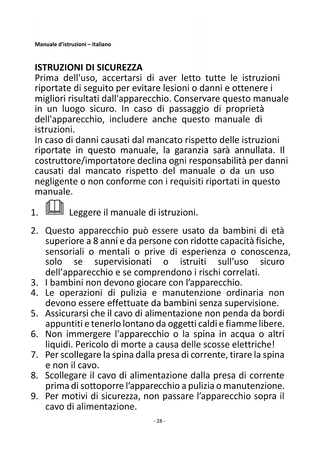 Prima dell'uso, accertarsi di aver letto tutte le istruzioni riportate di seguito per evitare lesioni o danni e ottenere i migliori risultati dall'apparecchio. Conservare questo manuale in un luogo sicuro. In caso di passaggio di proprietà dell'apparecchio, includere anche questo manuale di istruzioni. In caso di danni causati dal mancato rispetto delle istruzioni riportate in questo manuale, la garanzia sarà annullata. Il costruttore/importatore declina ogni responsabilità per danni causati dal mancato rispetto del manuale o da un uso negligente o non conforme con i requisiti riportati in questo manuale.