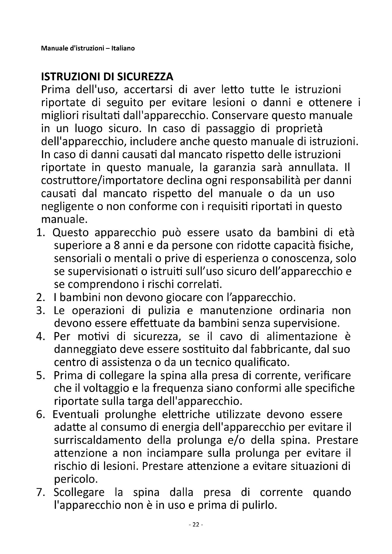 Prima dell'uso, accertarsi di aver letto tutte le istruzioni riportate di seguito per evitare lesioni o danni e ottenere i migliori risultati dall'apparecchio. Conservare questo manuale in un luogo sicuro. In caso di passaggio di proprietà dell'apparecchio, includere anche questo manuale di istruzioni. In caso di danni causati dal mancato rispetto delle istruzioni riportate in questo manuale, la garanzia sarà annullata. Il costruttore/importatore declina ogni responsabilità per danni causati dal mancato rispetto del manuale o da un uso negligente o non conforme con i requisiti riportati in questo manuale.