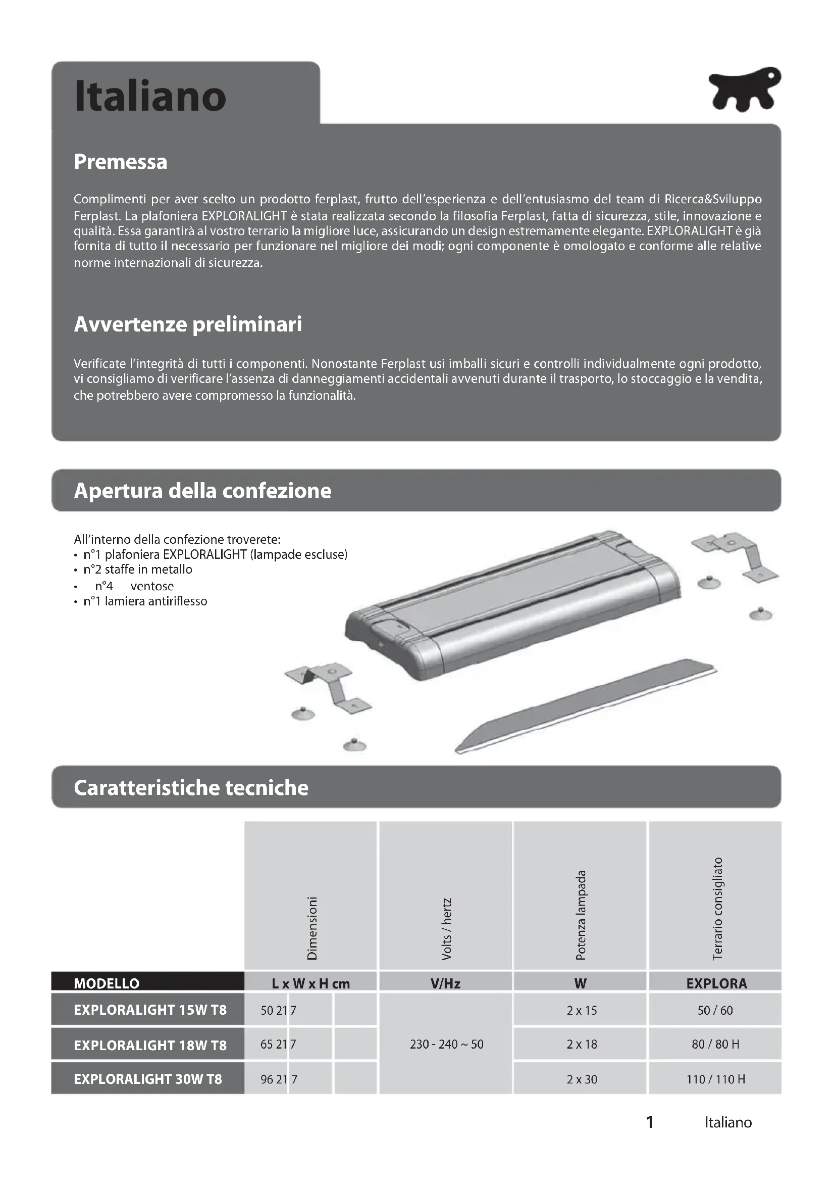 exploralight Manuale d’uso User's manual Manuel d’utilisation Handbuch Gebruiksaanwijzing Manual de usoItaliano Plafoniera per terrari 1 English Overtank lamp for terrariums 5 Français Plafonnier pour terrariums 9 Deutsch Terrariumlampen 13 Nederlands Lampen voor terrariums 17 Español Plafones para los terrarios 21 EXPLORALIGHTComplimenti per aver scelto un prodotto ferplast, frutto dell’esperienza e dell’entusiasmo del team di Ricerca&Sviluppo Ferplast. La plafoniera EXPLORALIGHT è stata realizzata secondo la filosofia Ferplast, fatta di sicurezza, stile, innovazione e qualità. Essa garantirà al vostro terrario la migliore luce, assicurando un design estremamente elegante. EXPLORALIGHT è già fornita di tutto il necessario per funzionare nel migliore dei modi; ogni componente è omologato e conforme alle relative norme internazionali di sicurezza. Italiano Premessa Verificate l’integrità di tutti i componenti. Nonostante Ferplast usi imballi sicuri e controlli individualmente ogni prodotto, vi consigliamo di verificare l’assenza di danneggiamenti accidentali avvenuti durante il trasporto, lo stoccaggio e la vendita, che potrebbero avere compromesso la funzionalità. Avvertenze preliminari L x W x H cm