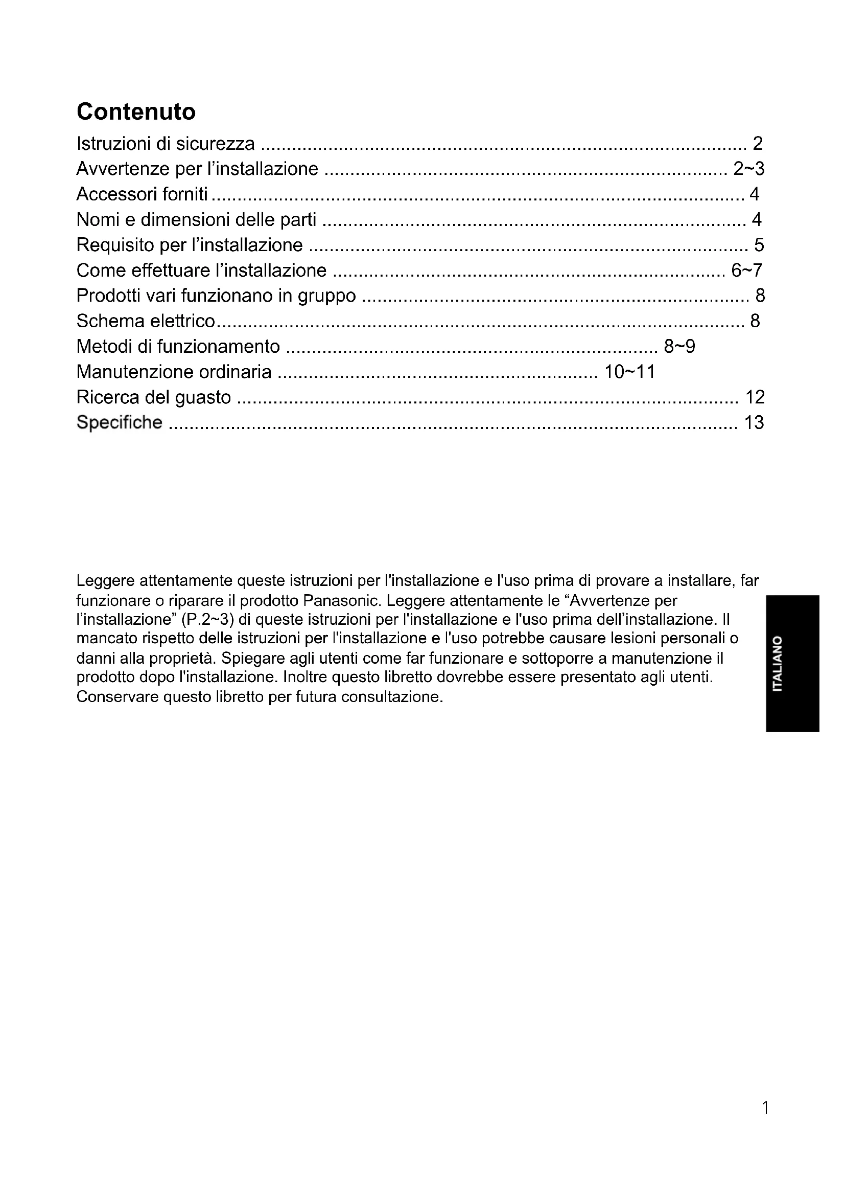 Leggere attentamente queste istruzioni per l'installazione e l'uso prima di provare a installare, far funzionare o riparare il prodotto Panasonic. Leggere attentamente le “Avvertenze per l’installazione” (P.2~3) di queste istruzioni per l'installazione e l'uso prima dell’installazione. Il mancato rispetto delle istruzioni per l'installazione e l'uso potrebbe causare lesioni personali o danni alla proprietà. Spiegare agli utenti come far funzionare e sottoporre a manutenzione il prodotto dopo l'installazione. Inoltre questo libretto dovrebbe essere presentato agli utenti. Conservare questo libretto per futura consultazione. 1Se il cavo di alimentazione è danneggiato, deve essere sostituito dal produttore, Questo apparecchio può essere utilizzato da bambini di età superiore agli 8 anni e e conoscenza se sono stati sottoposti a supervisione o istruzioni sull'utilizzo dell'apparecchio in modo sicuro e comprendono i rischi che comporta. I bambini non dovrebbero giocare con questo apparecchio. La pulizia e la manutenzione non dovrebbero essere svolte da bambini senza supervisione. Assicurarsi di scollegare l'alimentazione prima di pulire il prodotto. È necessario rispettare sempre le seguenti spiegazioni per evitare danni agli utenti o ad altre persone e prevenire danni alla proprietà. quando i dettagli dell’illustrazione vengono ignorati e l'unità in questione viene utilizzata in modo errato. AVVERTENZA poiché può causare la morte o lesioni gravi. ATTENZIONE la serie di illustrazioni) Questo simbolo indica l’oggetto “OBBLIGATORIO” che deve essere assolutamente seguito. Questo simbolo indica l’oggetto “VIETATO”. Istruzioni di sicurezza Avvertenze per l’installazione Installare un interruttore con tutti i poli la cui separazione del contatto superi i 3 mm (interruttore bipolare). Altrimenti potrebbe causare un cortocircuito e quindi un incendio. Non utilizzare il prodotto se non con la tensione nominale. danni al prodotto o incendi. Il prodotto deve essere con messa a terra. Altrimenti, potrebbe causare scosse problemi o perdite di corrente. I cavi dovrebbero essere collegati saldamente senza parti allentate. Altrimenti potrebbero causare un cortocircuito e quindi un incendio. L’installazione dovrebbe essere effettuata da una persona autorizzata. Il prodotto Altrimenti il prodotto potrebbe cadere Non ricostruire questo prodotto. AVVERTENZA 2Avvertenze per l’installazione Il prodotto deve essere installato da 2 persone. Altrimenti il prodotto potrebbe cadere Le parti apposite o dedicate, come i materiali di montaggio,devono essere utilizzate se tali parti sono fornite. Altrimenti il prodotto potrebbe cadere Il prodotto deve essere montato su una costruzione che sia abbastanza forte. Assicurarsi che possa portare 5 volte il peso del prodotto, La costruzione deve essere rinforzata se la forza non può essere assicurata. Altrimenti il prodotto potrebbe cadere giù e causare delle lesioni Indossare i guanti quando si installa il prodotto. Altrimenti possono ATTENZIONE saldamente. Altrimenti può provocare lesioni alle persone causate dalla caduta del prodotto. Non installare il prodotto con un metodo che non sia stato approvato nelle istruzioni per l'installazione e l'uso. Altrimenti il prodotto potrebbe cadere È vietato installare il prodotto in luoghi come macchinari, impianti chimici o strutture di ricerca in cui sarà esposto a gas nocivi contenenti acidi, alcali, solventi organici, fumi di vernice, ecc., a gas che contengono ingredienti corrosivi. Può causare avvelenamento da gas, corrosione e degradazione del prodotto che provoca un incendio. AVVERTENZA È vietato installare il prodotto nei seguenti luoghi. Non installare il prodotto dove è presente del vapore. Luoghi con gas combustibile o emissioni di gas di scarico. Non installare il prodotto fuori Interno Esterno un cortocircuito e quindi un incendio. un cortocircuito e quindi un incendio. Altrimenti il prodotto potrebbe bagnarsi con la pioggia e causare un cortocircuito. 3aver aperto la confezione e nel caso in cui manchi qualcosa rivolgersi al nostro Centro di assistenza post-vendita o al rivenditore. N. Nome Quantità N. Nome Quantità Guarnizione 6 Bullone M8×60L 6 Rondella spaccata