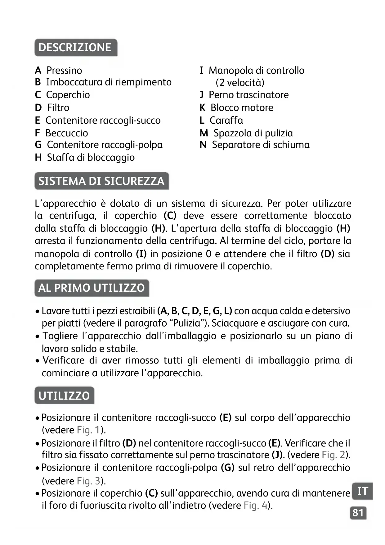 UTILIZZO A Pressino B Imboccatura di riempimento C Coperchio D Filtro E Contenitore raccogli-succo F Beccuccio G Contenitore raccogli-polpa H Staffa di bloccaggio I Manopola di controllo (2 velocità) J Perno trascinatore K Blocco motore L Caraffa M Spazzola di pulizia N Separatore di schiuma L’apparecchio è dotato di un sistema di sicurezza. Per poter utilizzare la centrifuga, il coperchio (C) deve essere correttamente bloccato dalla staffa di bloccaggio (H). L’apertura della staffa di bloccaggio (H) arresta il funzionamento della centrifuga. Al termine del ciclo, portare la manopola di controllo (I) in posizione 0 e attendere che il filtro (D) sia completamente fermo prima di rimuovere il coperchio.