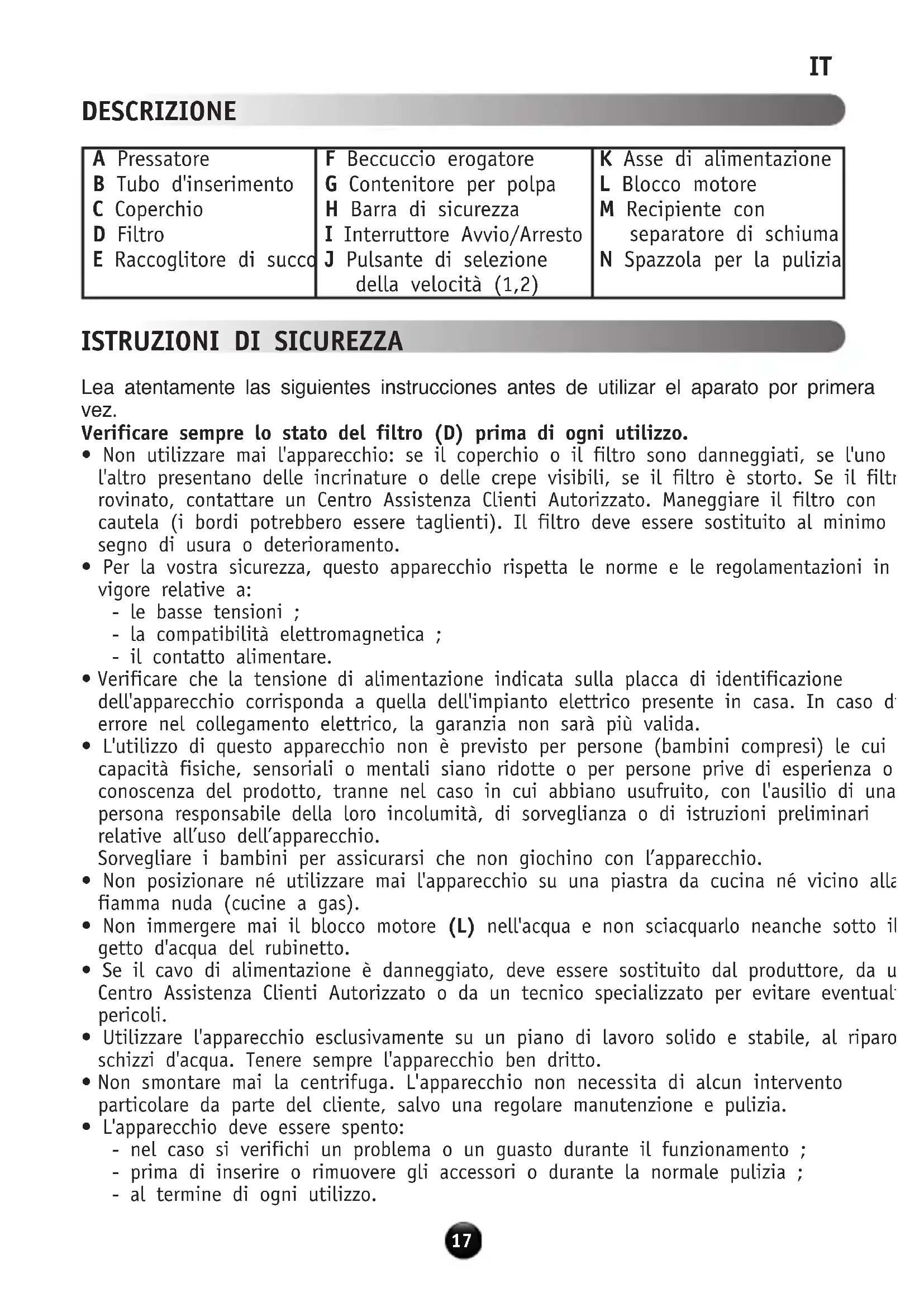 A Pressatore B Tubo d'inserimento C Coperchio D Filtro E Raccoglitore di succo F Beccuccio erogatore G Contenitore per polpa H Barra di sicurezza I Interruttore Avvio/Arresto J Pulsante di selezione della velocità (1,2) K Asse di alimentazione L Blocco motore M Recipiente con separatore di schiuma N Spazzola per la pulizia Notice_2550444-03:Mise en page 1 8/11/10 14:57 Page 17• Non tirare mai il cavo di alimentazione per staccare la spina.
