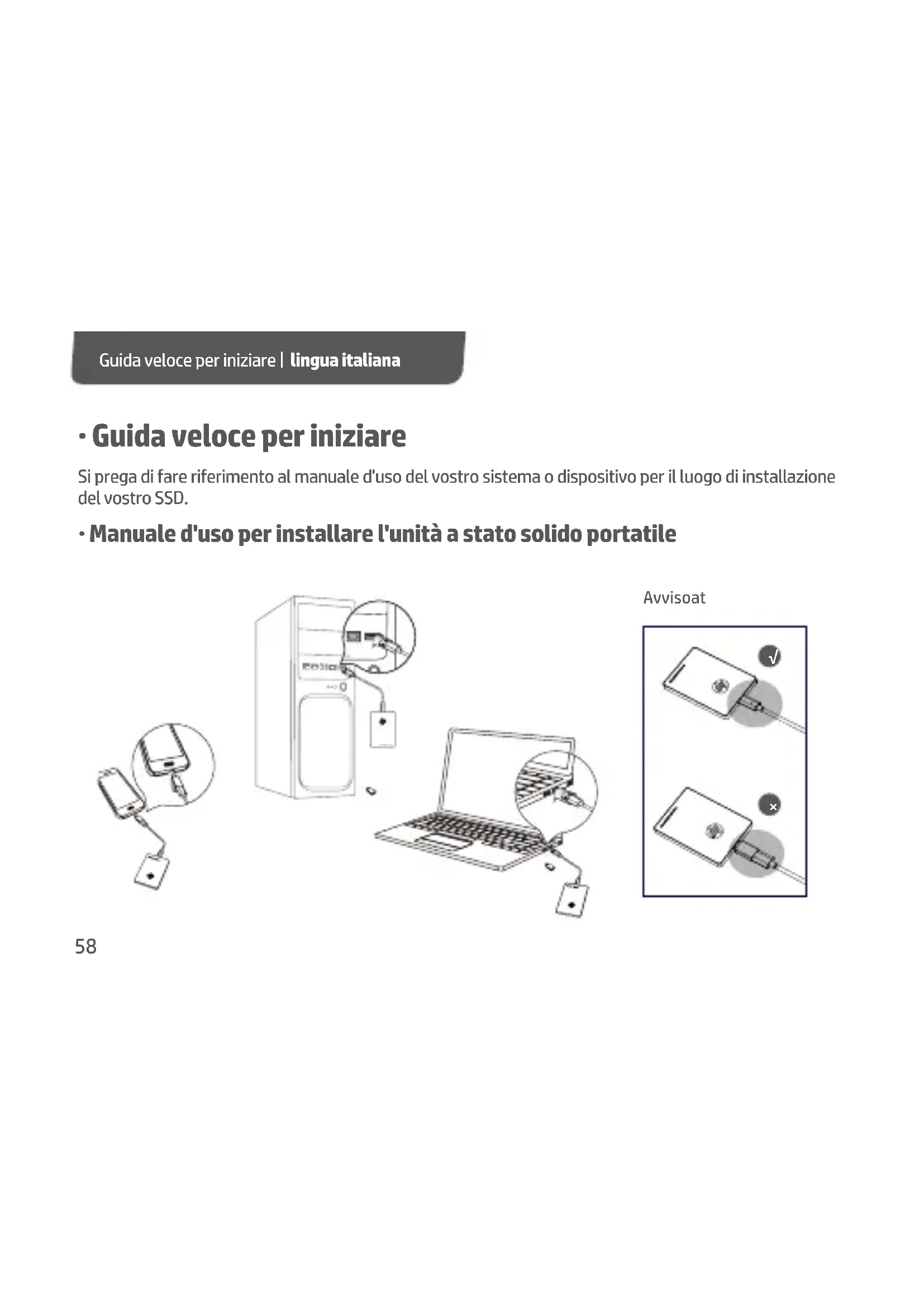 - Manuale d'uso per installare l'unità a stato solido portatile Si prega di fare riferimento al manuale d'uso del vostro sistema o dispositivo per il luogo di installazione del vostro SSD. Guida veloce per iniziare | lingua italiana Portable SSD P700