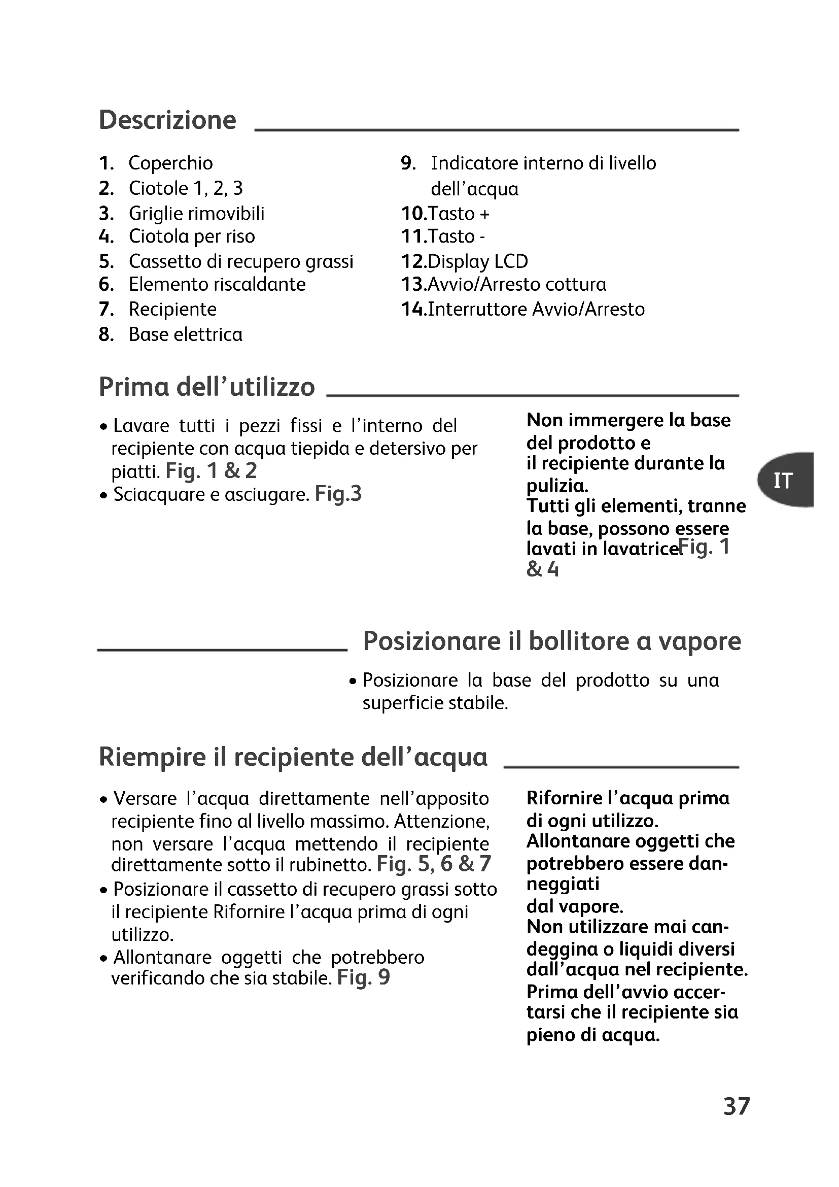 - Allontanare oggetti che potrebbero verificando che sia stabile. Fig. 9 Non immergere la base del prodotto e il recipiente durante la pulizia. Tutti gli elementi, tranne la base, possono essere lavati in lavatrice. Fig. 1 & 4 Rifornire l’acqua prima di ogni utilizzo. Allontanare oggetti che potrebbero essere dan- neggiati dal vapore. Non utilizzare mai can- deggina o liquidi diversi dall’acqua nel recipiente. Prima dell’avvio accer- tarsi che il recipiente sia pieno di acqua.