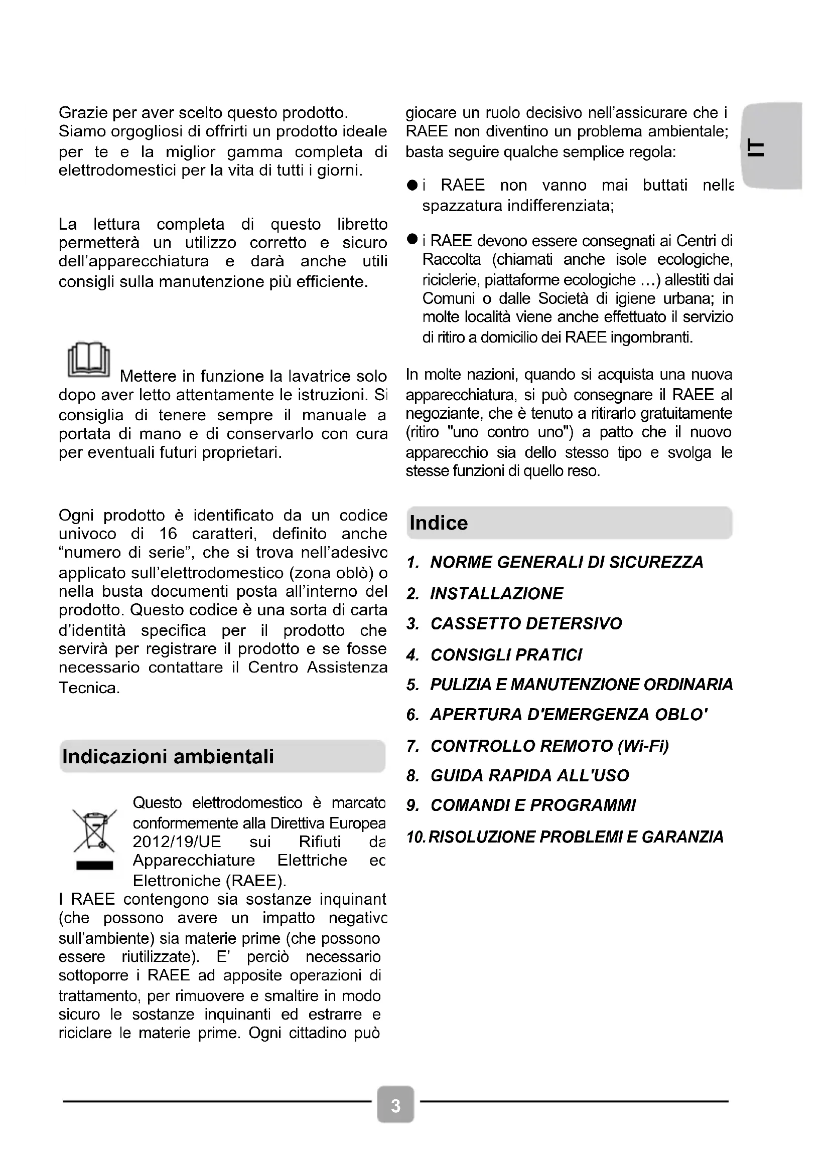 Mettere in funzione la lavatrice solo dopo aver letto attentamente le istruzioni. Si consiglia di tenere sempre il manuale a portata di mano e di conservarlo con cura per eventuali futuri proprietari.