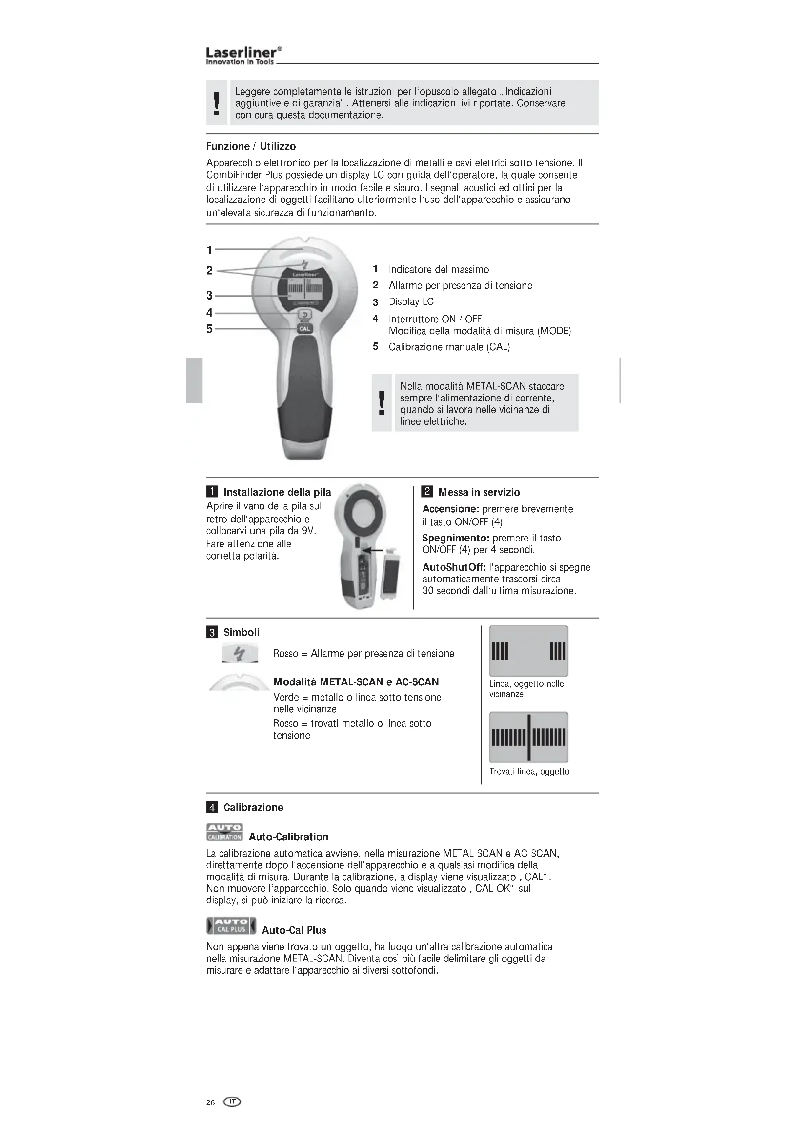 Apparecchio elettronico per la localizzazione di metalli e cavi elettrici sotto tensione. Il CombiFinder Plus possiede un display LC con guida dell‘operatore, la quale consente di utilizzare l‘apparecchio in modo facile e sicuro. I segnali acustici ed ottici per la localizzazione di oggetti facilitano ulteriormente l‘uso dell‘apparecchio e assicurano un‘elevata sicurezza di funzionamento. Indicatore del massimo Allarme per presenza di tensione Display LC Interruttore ON / OFF Modifica della modalità di misura (MODE) Calibrazione manuale (CAL) Aprire il vano della pila sul retro dell‘apparecchio e collocarvi una pila da 9V. Fare attenzione alle corretta polarità. Installazione della pila Accensione: premere brevemente il tasto ON/OFF (4). Spegnimento: premere il tasto ON/OFF (4) per 4 secondi. AutoShutOff: l‘apparecchio si spegne automaticamente trascorsi circa 30 secondi dall‘ultima misurazione. Messa in servizio Auto-Calibration La calibrazione automatica avviene, nella misurazione METAL-SCAN e AC-SCAN, direttamente dopo l‘accensione dell‘apparecchio e a qualsiasi modifica della modalità di misura. Durante la calibrazione, a display viene visualizzato „CAL“. Non muovere l‘apparecchio. Solo quando viene visualizzato „CAL OK“ sul display, si può iniziare la ricerca. Auto-Cal Plus Non appena viene trovato un oggetto, ha luogo un‘altra calibrazione automatica nella misurazione METAL-SCAN. Diventa così più facile delimitare gli oggetti da misurare e adattare l‘apparecchio ai diversi sottofondi. Calibrazione Nella modalità METAL-SCAN staccare sempre l‘alimentazione di corrente, quando si lavora nelle vicinanze di linee elettriche.