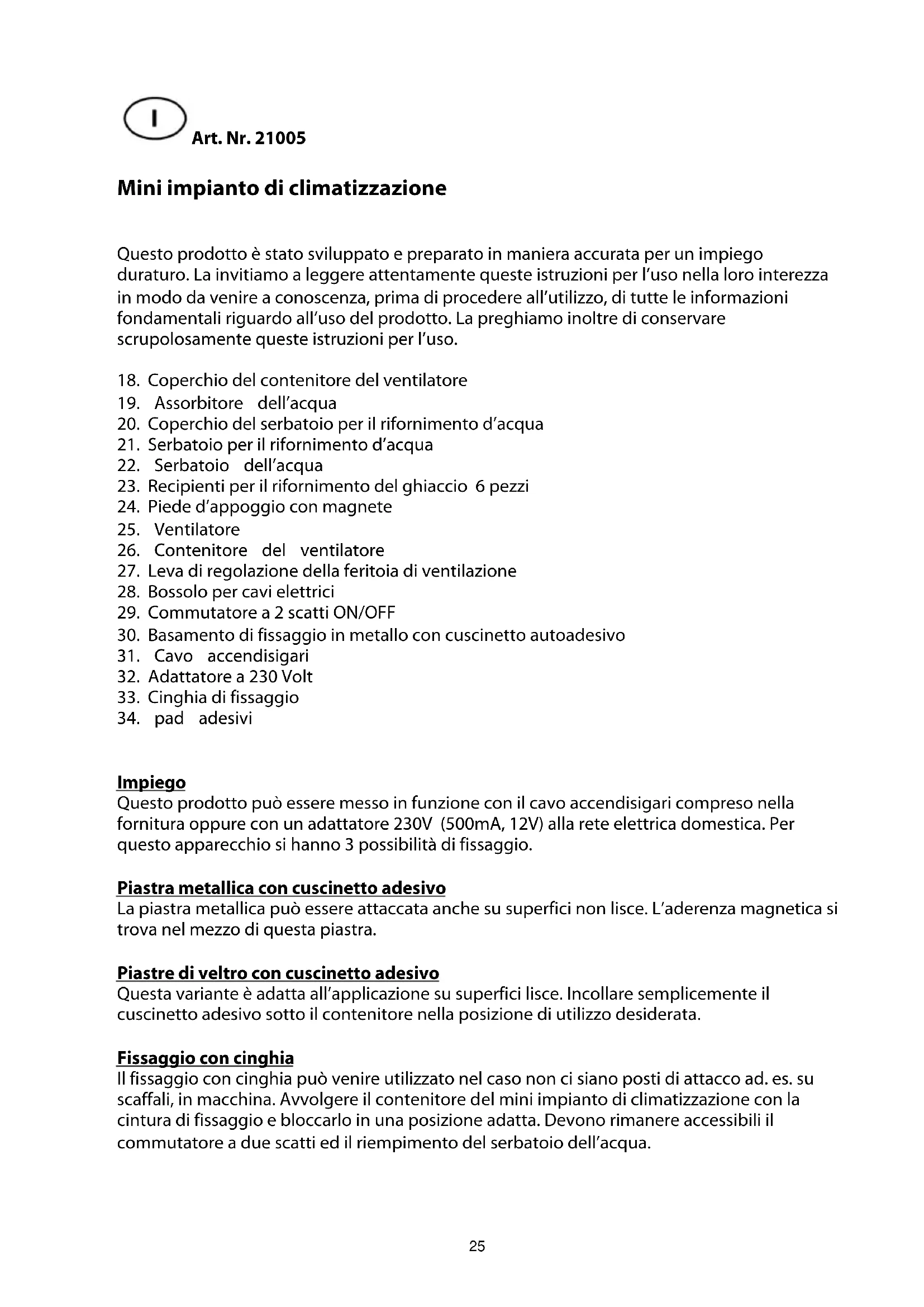 Installazione Rimuovere il cuscinetto adesivo della piastra metallica e fissare nella posizione desiderata. Mettere il piede di appoggio con il magnete sulla piastra metallica. Per raggiungere una buona ventilazione, la distanza tra il mini impianto di climatizzazione e la persona non deve essere superiore a 0,5 m. Funzione Aprire il coperchio del contenitore del serbatoio dell’acqua. Estrarre il serbatoio dell’acqua, svitare il coperchio a vite e riempire il serbatoio con acqua fredda. Posizionare nuovamente il serbatoio dell’acqua nel contenitore ed aspettare circa 15 minuti, affinché le lamelle dell’assorbitore dell’acqua abbiano il tempo di assorbire completamente il liquido. Mettere in funzione il mini impianto di climatizzazione per mezzo del commutatore a 2 scatti posizionandolo sulla velocità di aerazione desiderata - I per una ventilazione minore e II per una ventilazione maggiore. Per un effetto di climatizzazione ancora migliore, riempire semplicemente i 6 cilindri del ghiaccio con acqua e metterli a congelare. Porre nuovamente i cilindri del ghiaccio congelati nel serbatoio dell’acqua. Pulizia Aprire il coperchio del contenitore e estrarre l’assorbitore dell’acqua. Si consiglia di pulire le lamelle dell’assorbitore una volta alla settimana. Spazzolare le lamelle delicatamente con lisciva di sapone. Dopo la pulizia, porre nuovamente l’assorbitore dell’acqua nel contenitore e chiudere il coperchio. Per la messa in funzione non si deve aspettare che le lamelle si siano asciugate. Raccomandazione Si assicuri che il mini impianto di climatizzazione venga riposto in un posto asciutto e al riparo da umidità. Attenzione ! Impiego su autovettura Per l’utilizzo su autovettura, il mini impianto di climatizzazione deve essere posizionato in modo che non sia di disturbo alla visuale. Il mini impianto di climatizzazione deve essere montato in modo sicuro e fisso per evitare il pericolo di incidenti (frenare etc.) Specifiche